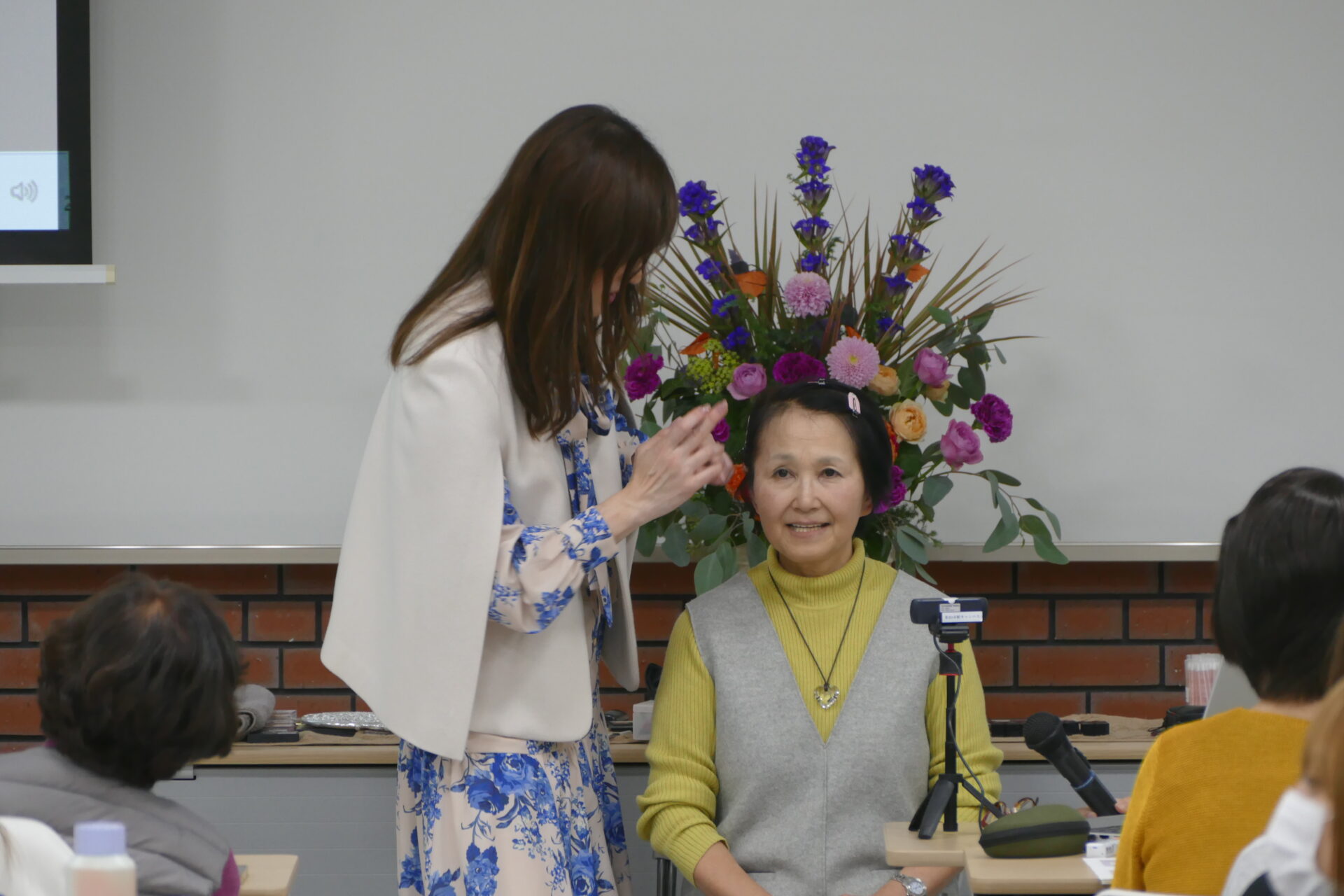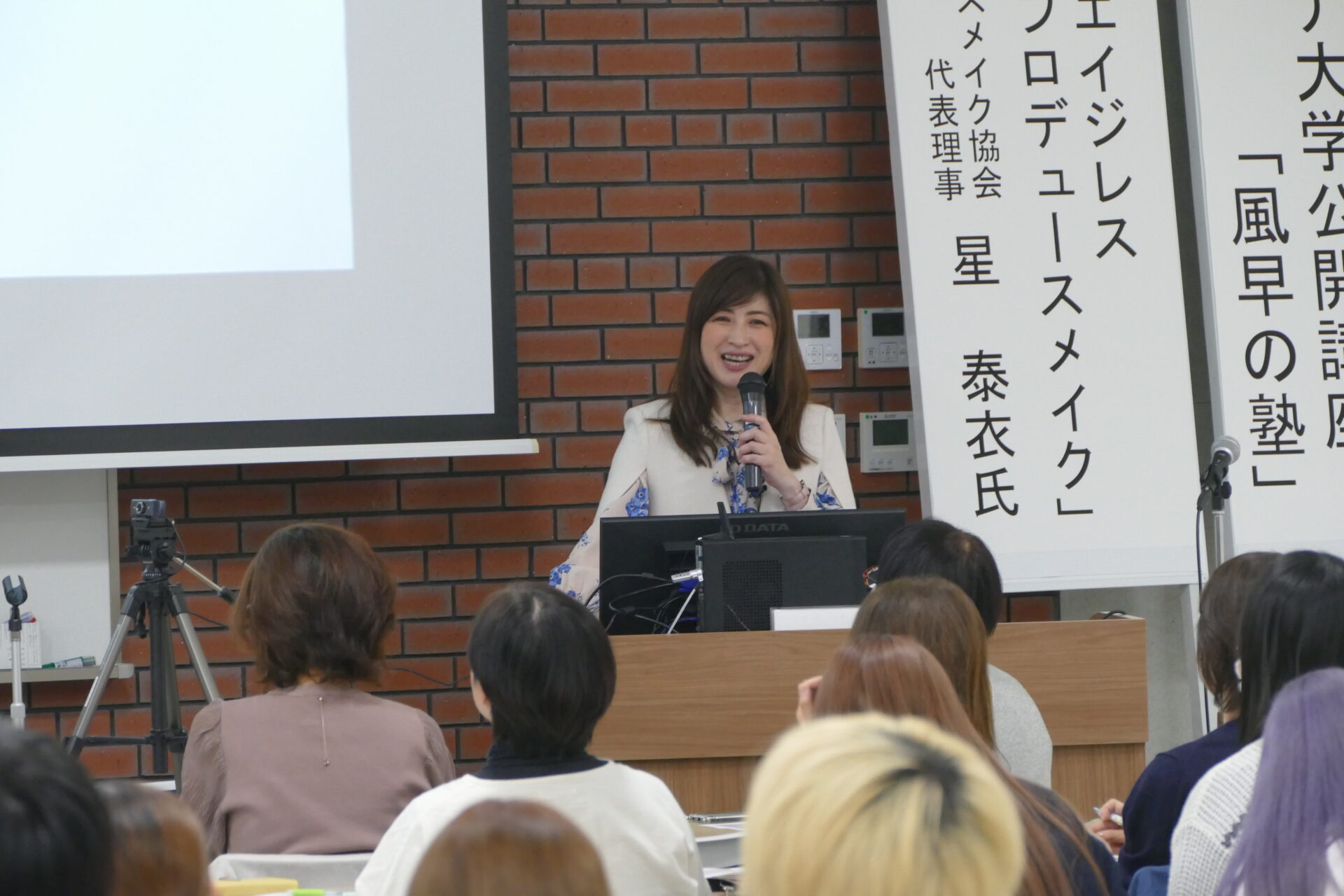 2025年度 愛媛銀行寄付講座「風早の塾」第5回は、「魅力UP!エイジレス セルフプロデュースメイク」と題して、メイクアップアーティストの星泰衣(ほし やすえ)先生に講演とメイクの実演を賜りました。日本セルフプロデュースメイク協会の代表理事として活躍される星先生は、「メイクは生きる力」であり、「メイクをデザインすることは、人生をデザインすること」と仰います。