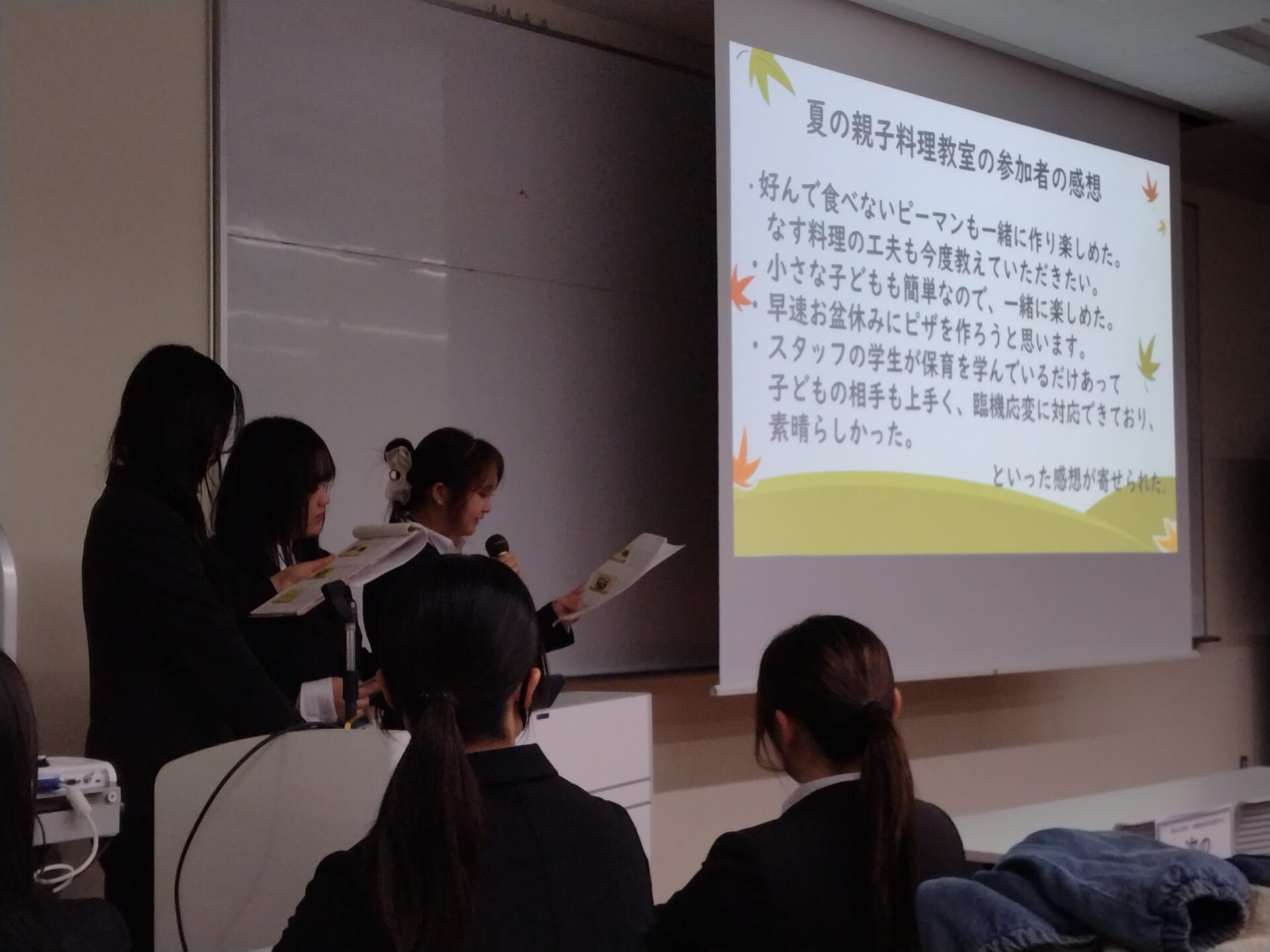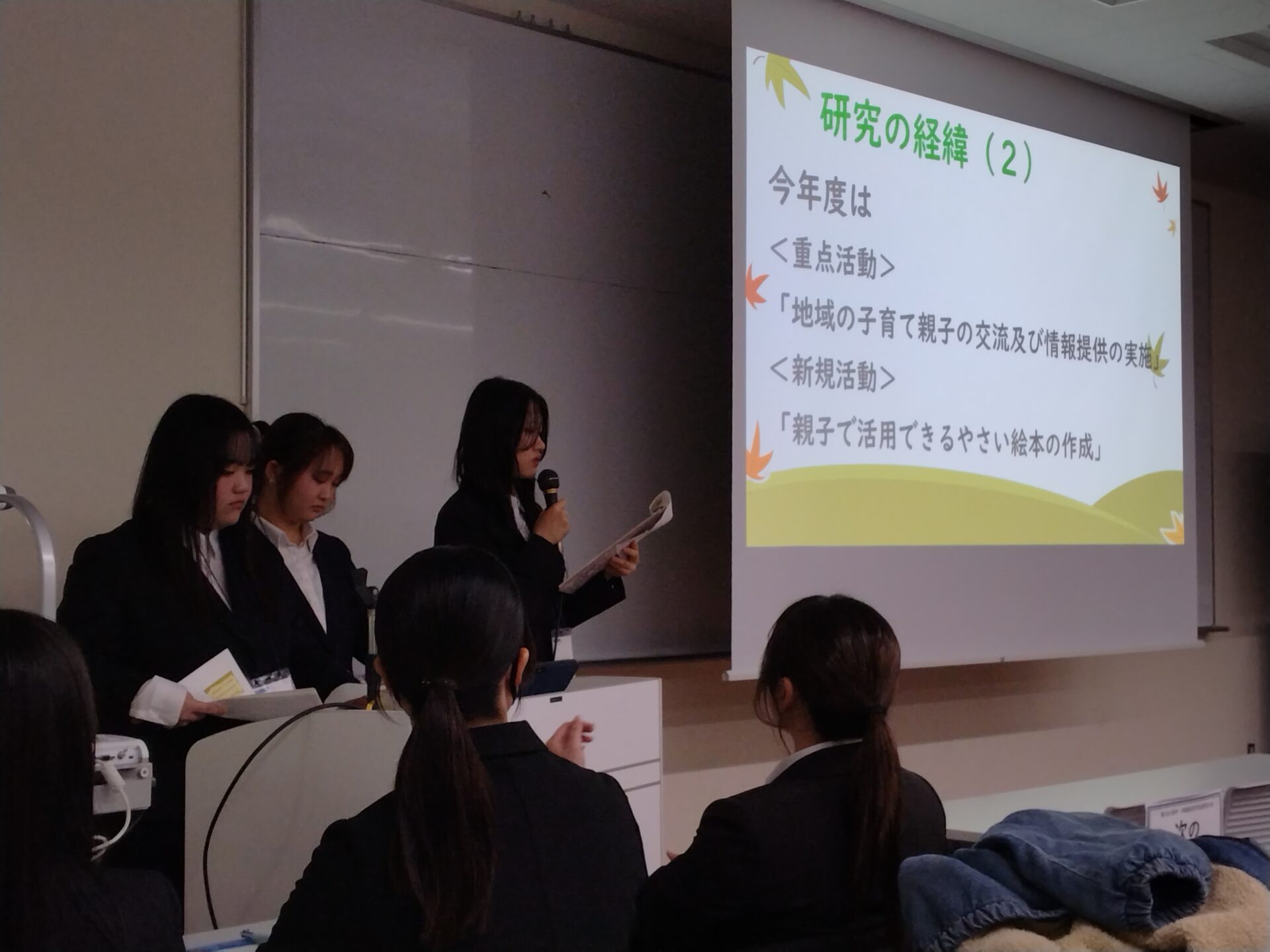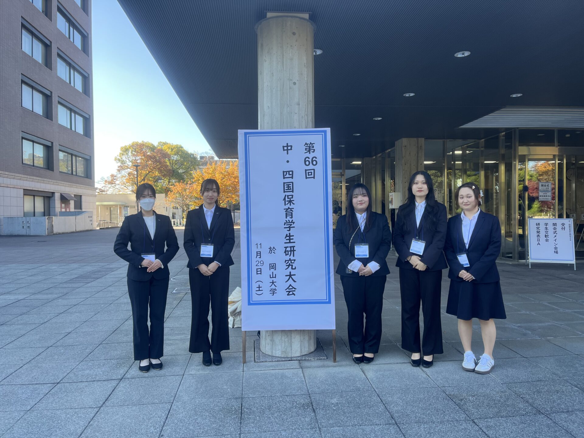 11月29日(土)に岡山大学で開催された「第66回 中・四国保育学生研究大会」に、保育学科学生2年の5名が参加しました。 中・四国地方の32校、約900名の保育学生が岡山に集い、日頃の研究の成果を発表しました。 本学は、「野菜で子育て支援~地域に広げる食育活動について~」というテーマで発表を行いました。 具体的には、夏に実施した「親子料理教室」や10月の大学祭、11月に地域の集会室や畑で行った「収穫祭」など、学生自身が企画・運営した親子活動についてまとめて報告しました。 他校の発表を聞く中で、新たな視点や気づきを得られ、互いに学び合える大変貴重な機会となりました。