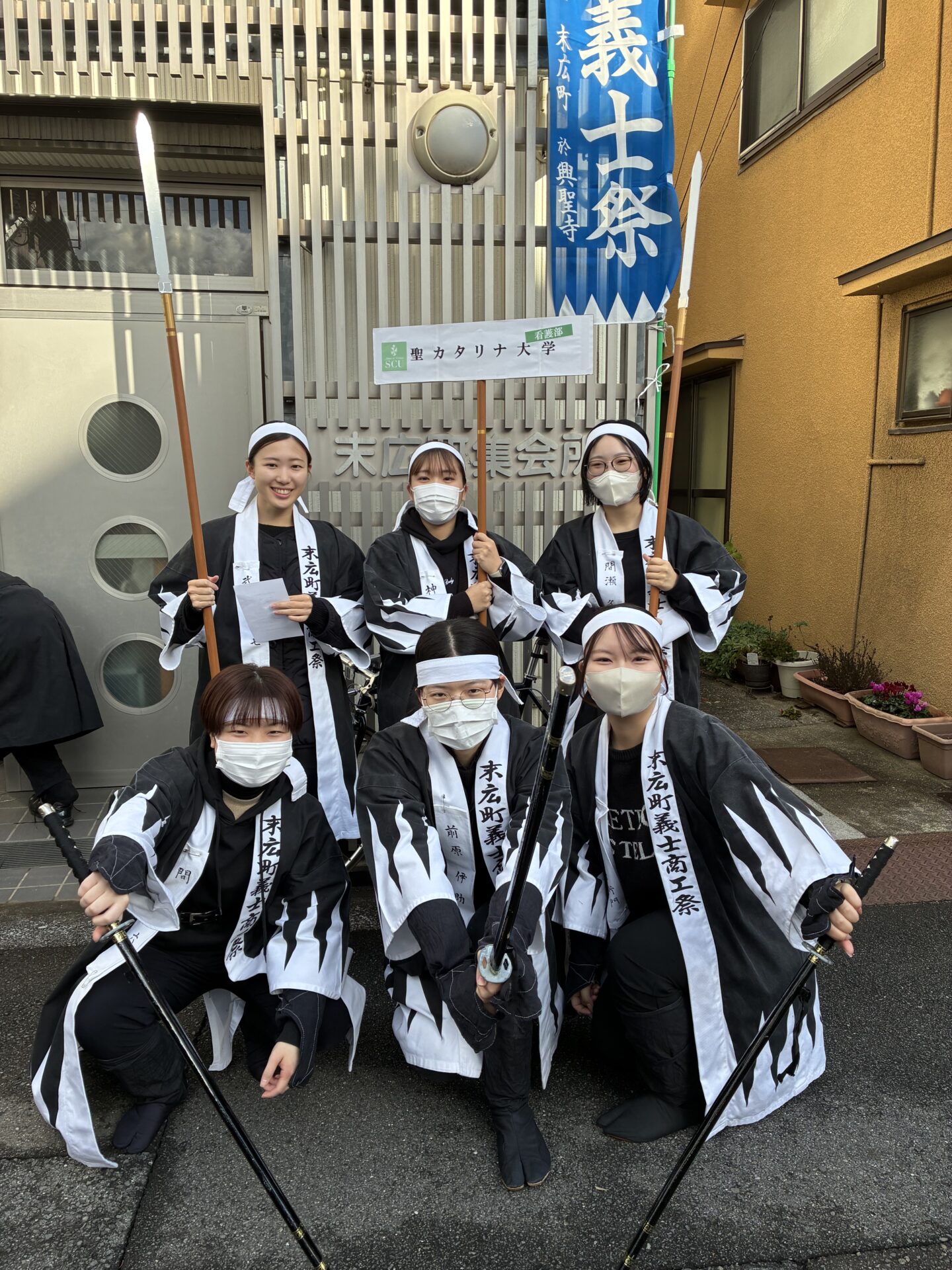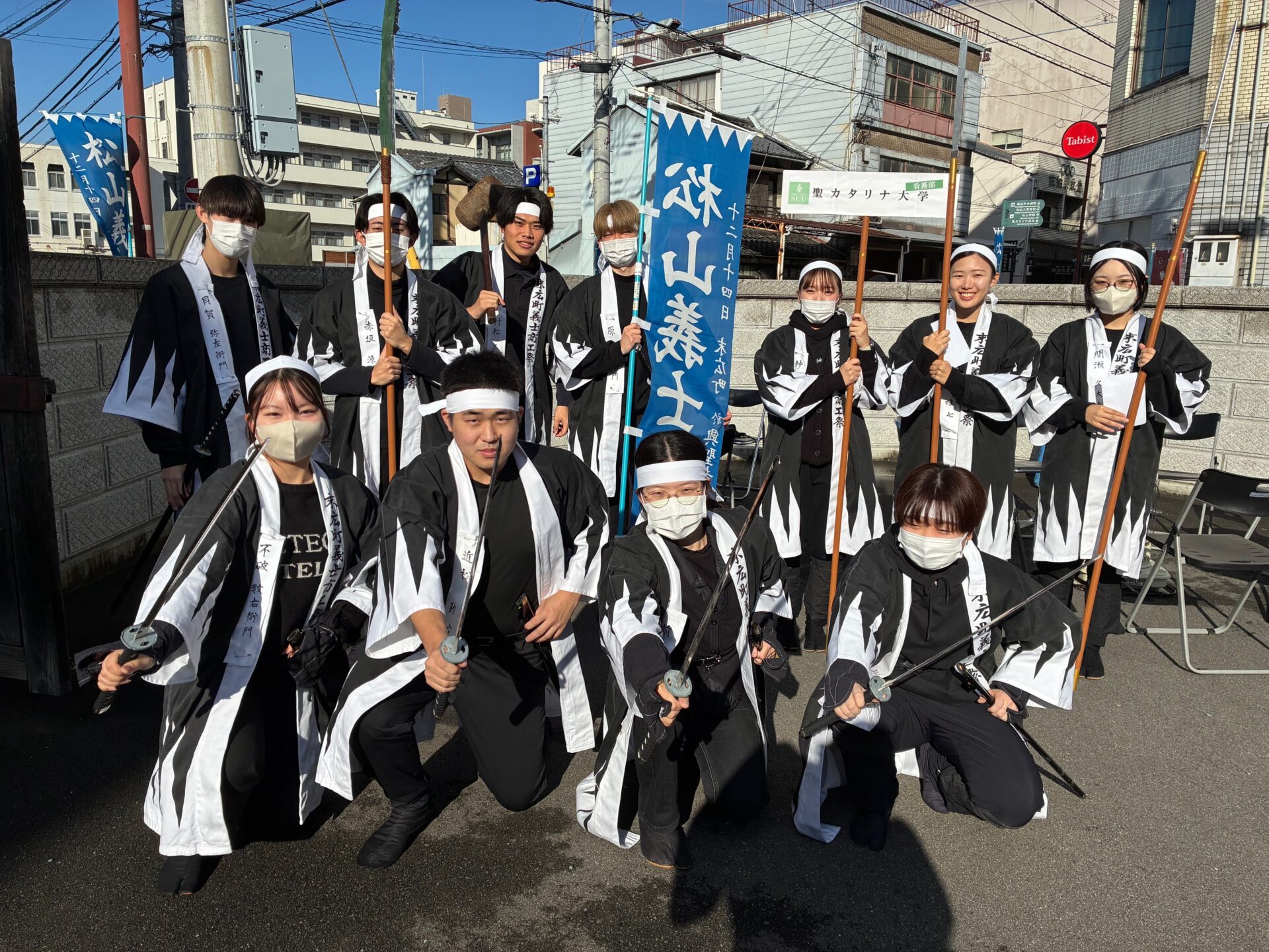 2025年12月14日に松山義士祭に参加しました。松山義士祭は、赤穂浪士討ち入りの12月14日に開催される、松山の師走を彩る伝統的な行事です。松山市駅キャンパス近隣の興聖寺を中心に行われ、義士に扮した参加者が末広町通りから市駅前までをパレードします。