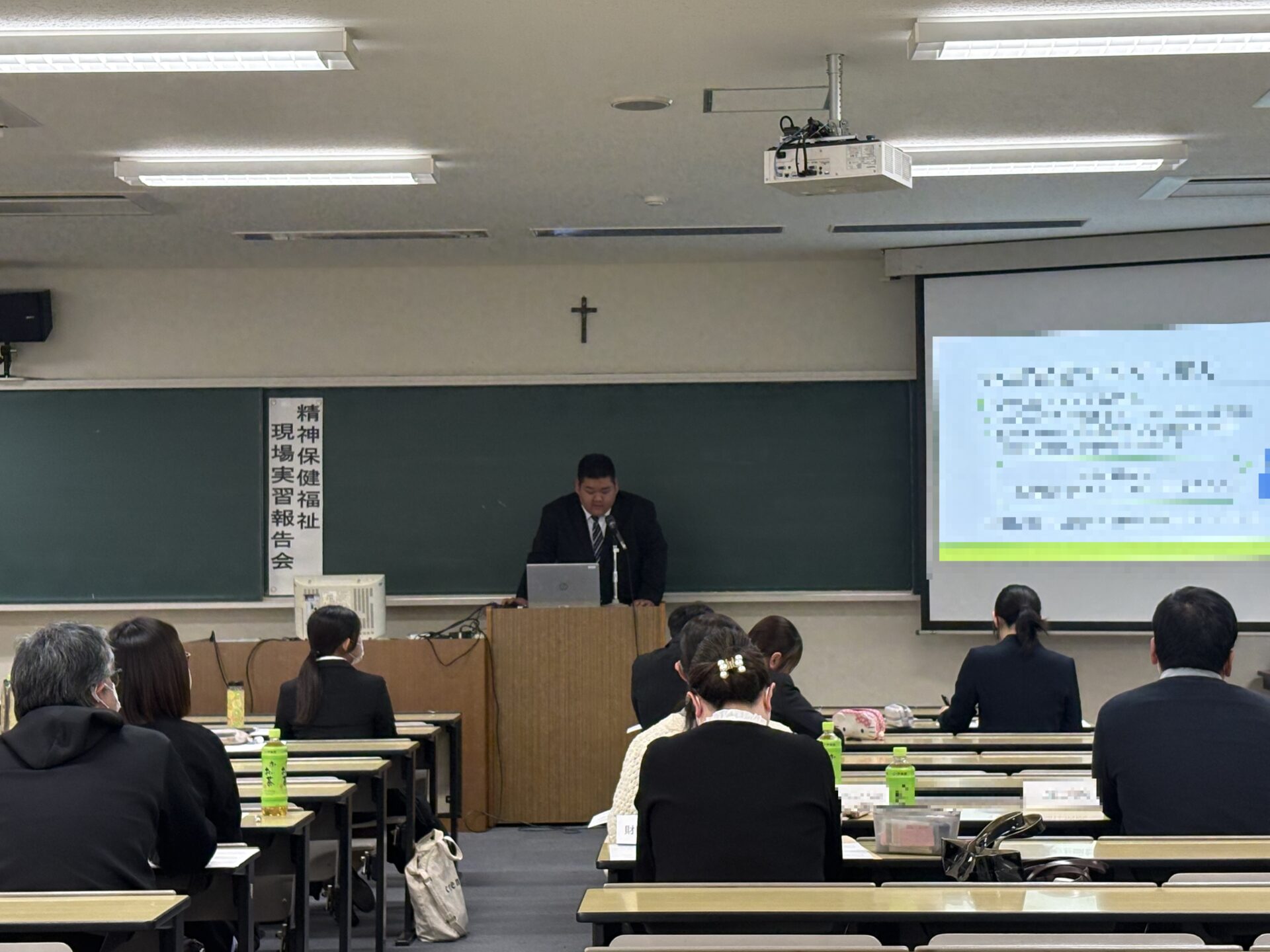 2025(令和7)年12月23日(火)「精神保健福祉現場実習報告会」を開催しました。 社会福祉学科の学生(2022年度入学生)が、精神保健福祉現場実習の集大成として、現場実習でのさまざまな経験を振り返り、考察したことをまとめ、発表しました。実習指導者の方々にもご来場いただき、活発な意見交換がなされ、貴重な助言をいただきました。
