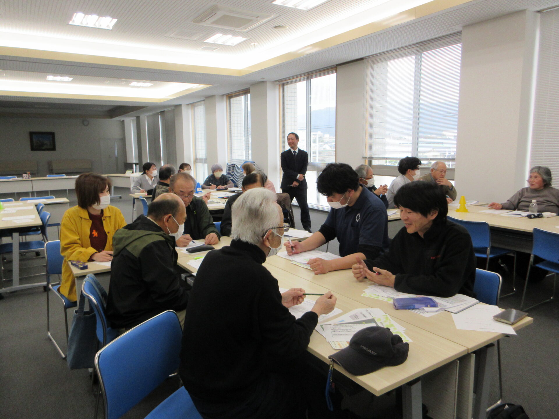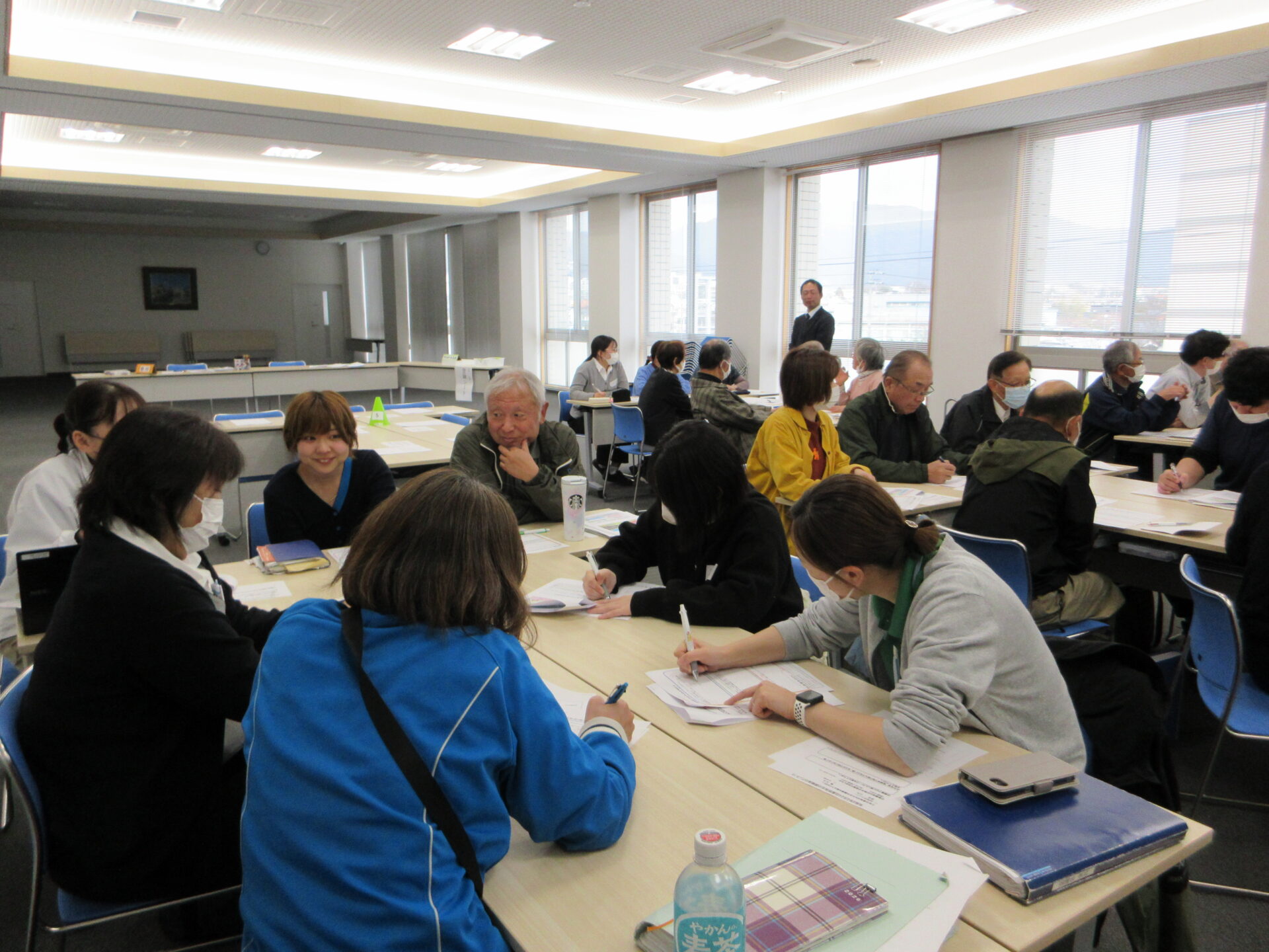 本研修は地域内で生じる暮らしの中の困りごとの改善や、孤立しがちな高齢者の楽しみの場を住民の互助の力で開発することができるよう、担い手の発掘・養成を目的としたものです。現代人間学科ソーシャルワークコースの教授である釜野鉄平先生が講師を務めており、社会福祉士を目指す2年生の学生2名も参加しました。