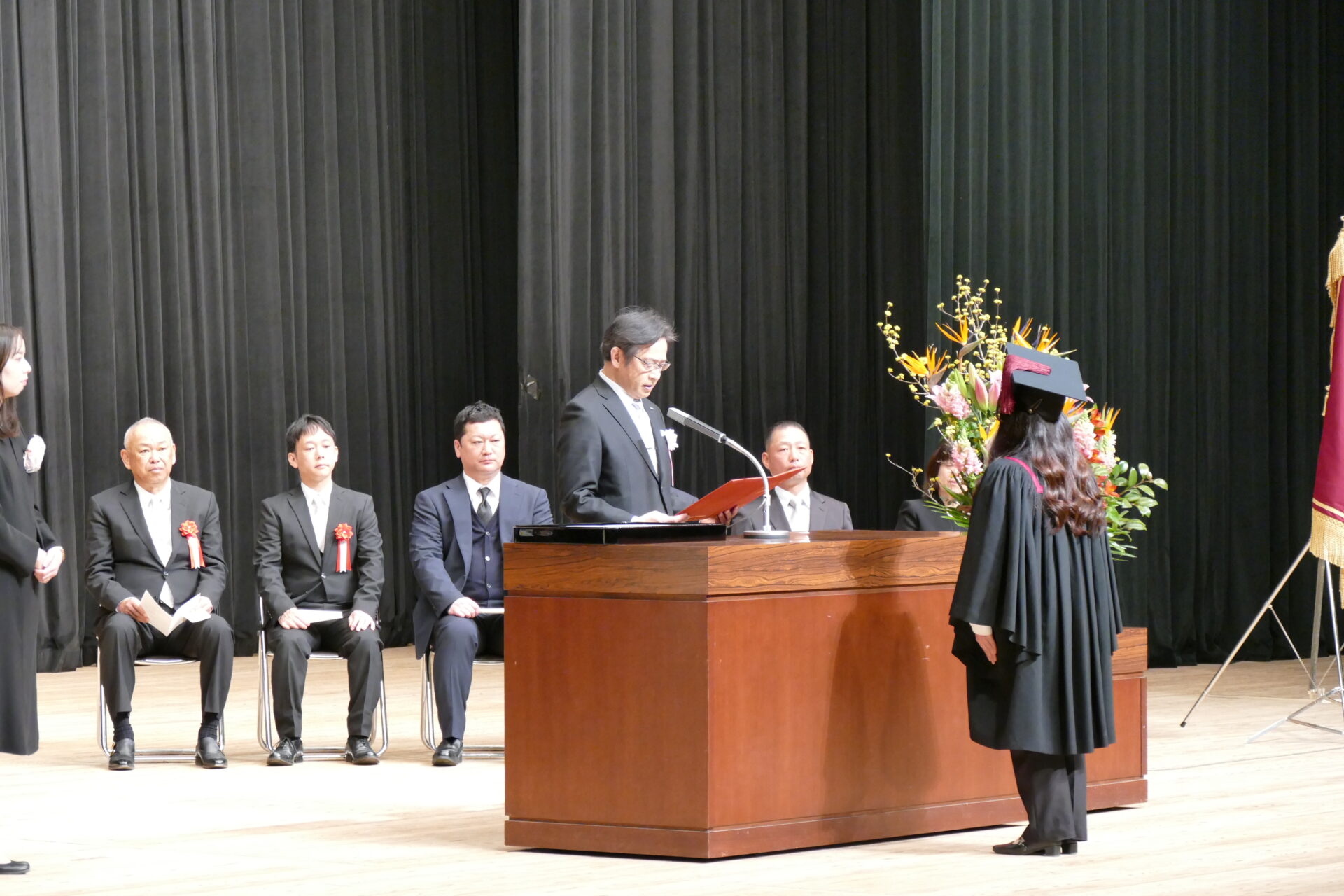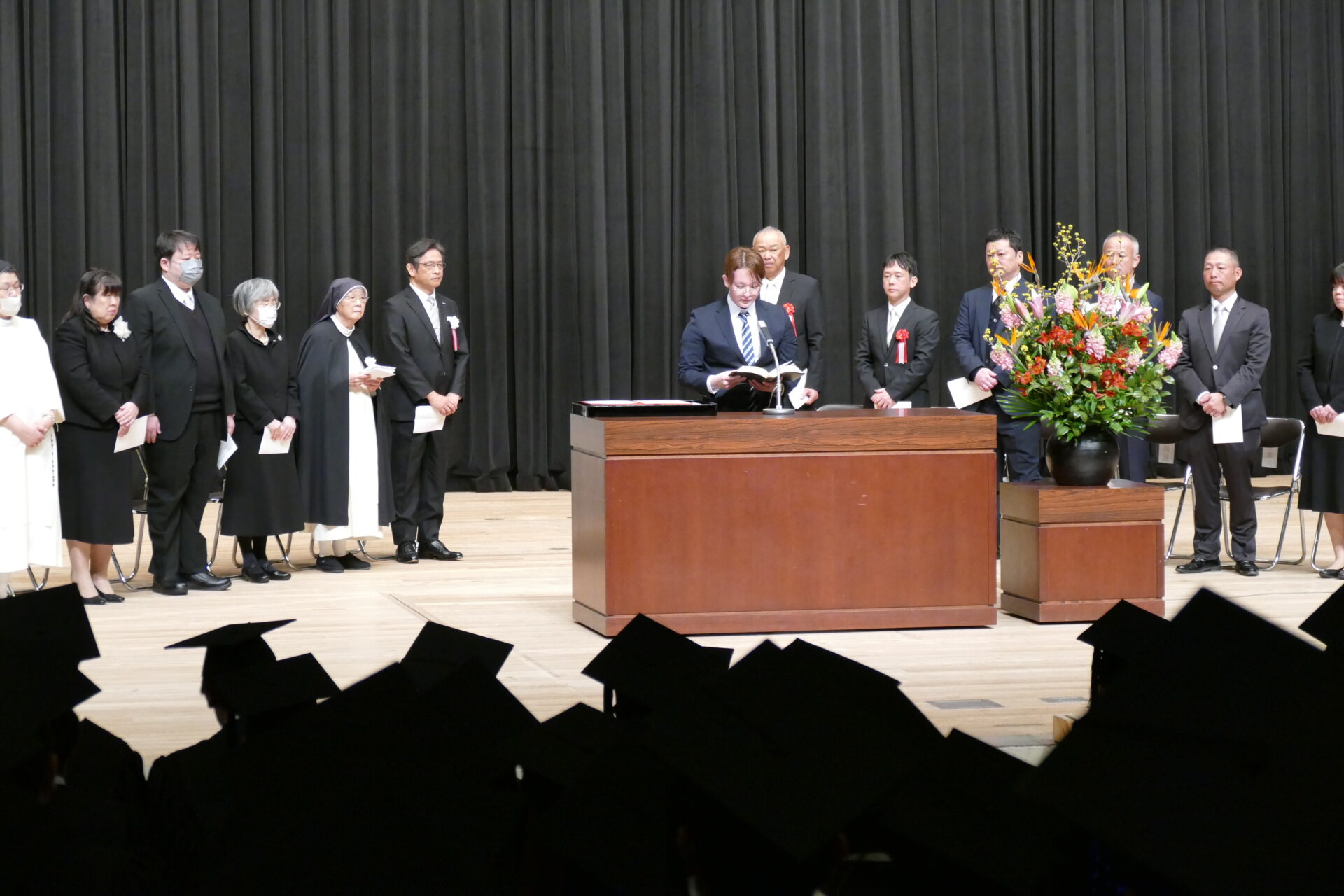 当日は厳かな雰囲気の中、卒業生・修了生がガウンと角帽を身にまとい、聖歌斉唱や聖書朗読が行われました。続いて、坂原学長から各学科の代表者に卒業証書・学位記が授与され、卒業生・修了生はそれぞれ新たな門出を迎えました。