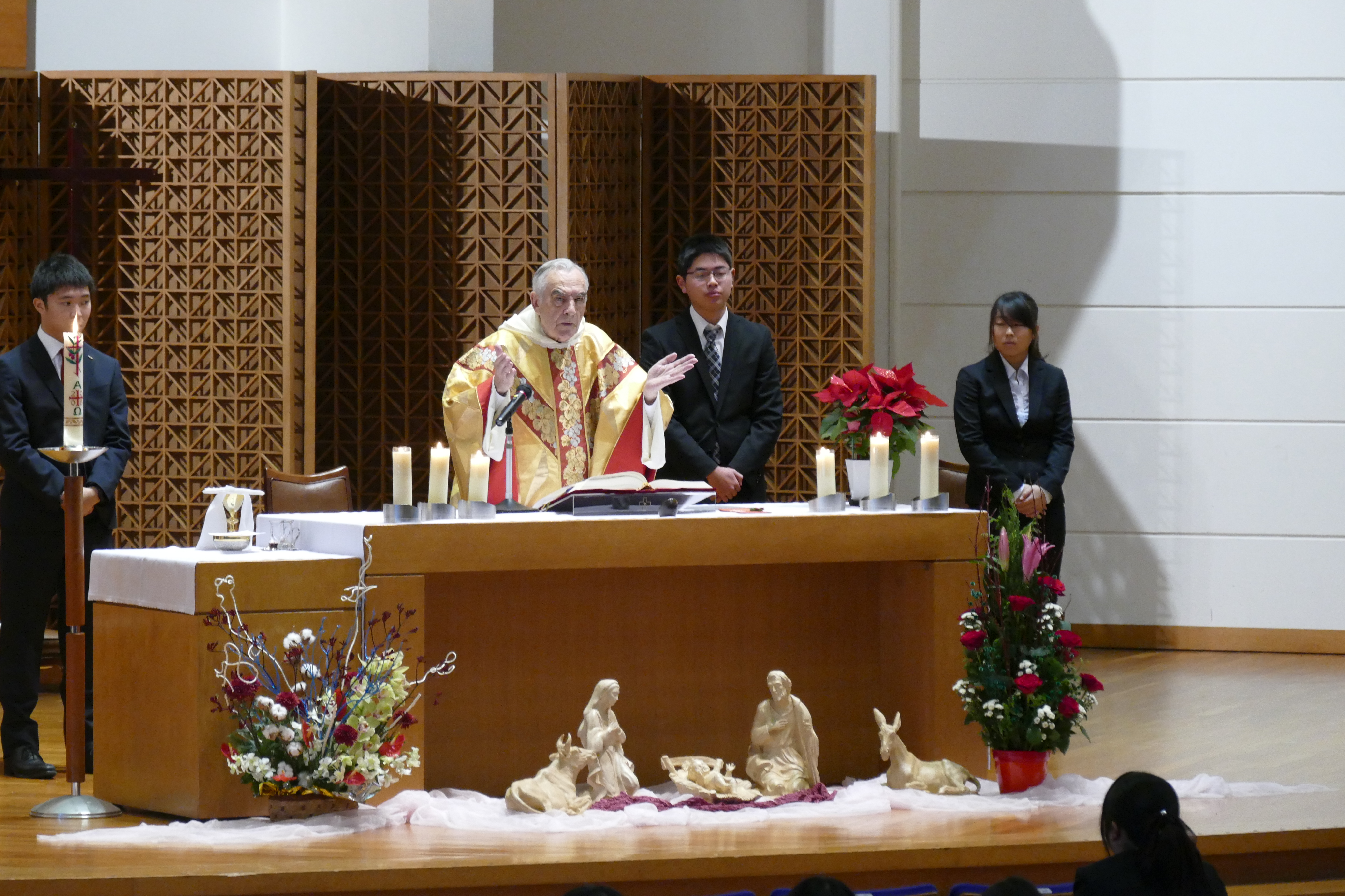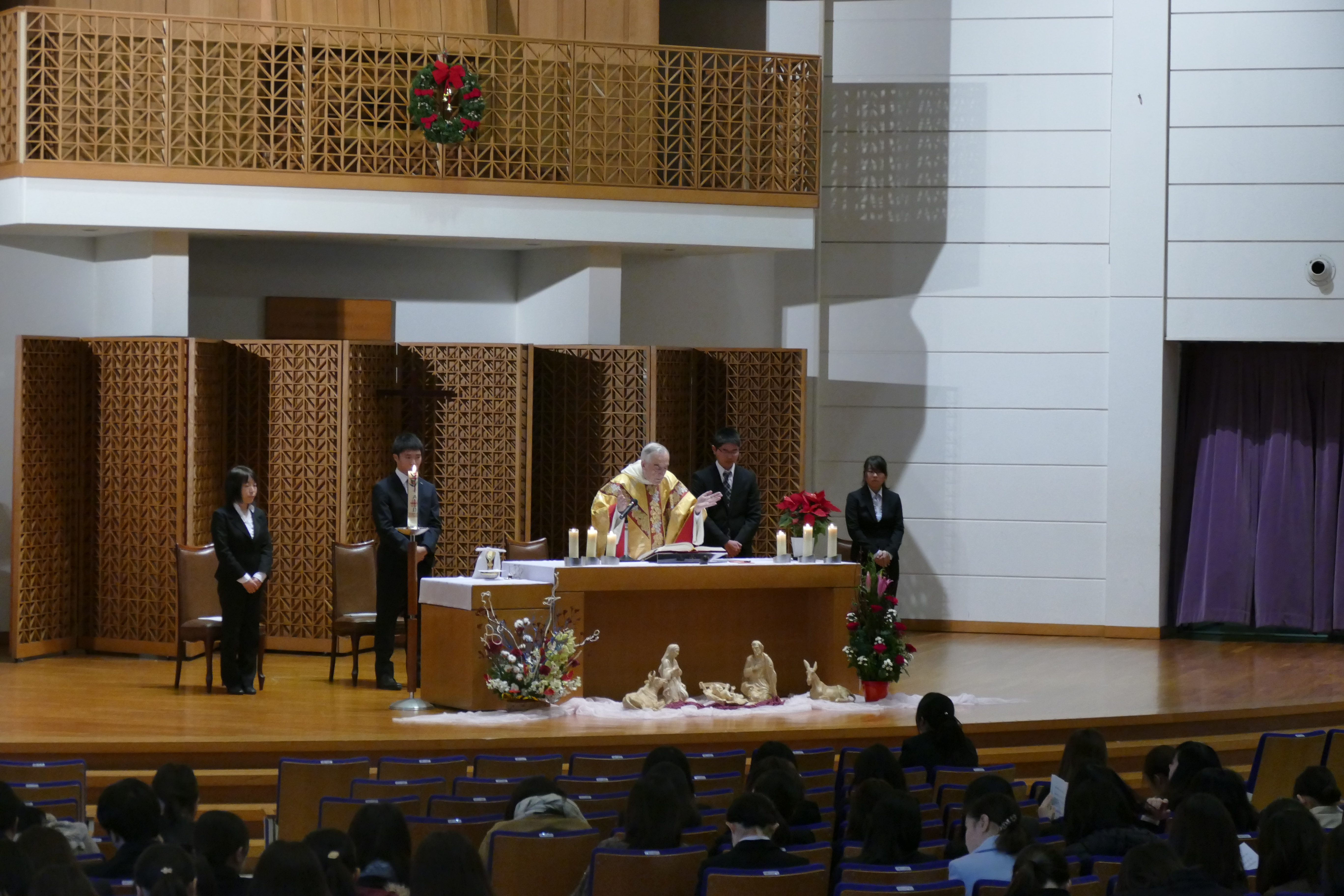 最初にホビノ・サンミゲル学長の司式によるクリスマスミサが行われ厳粛な中、祈りが捧げられました。