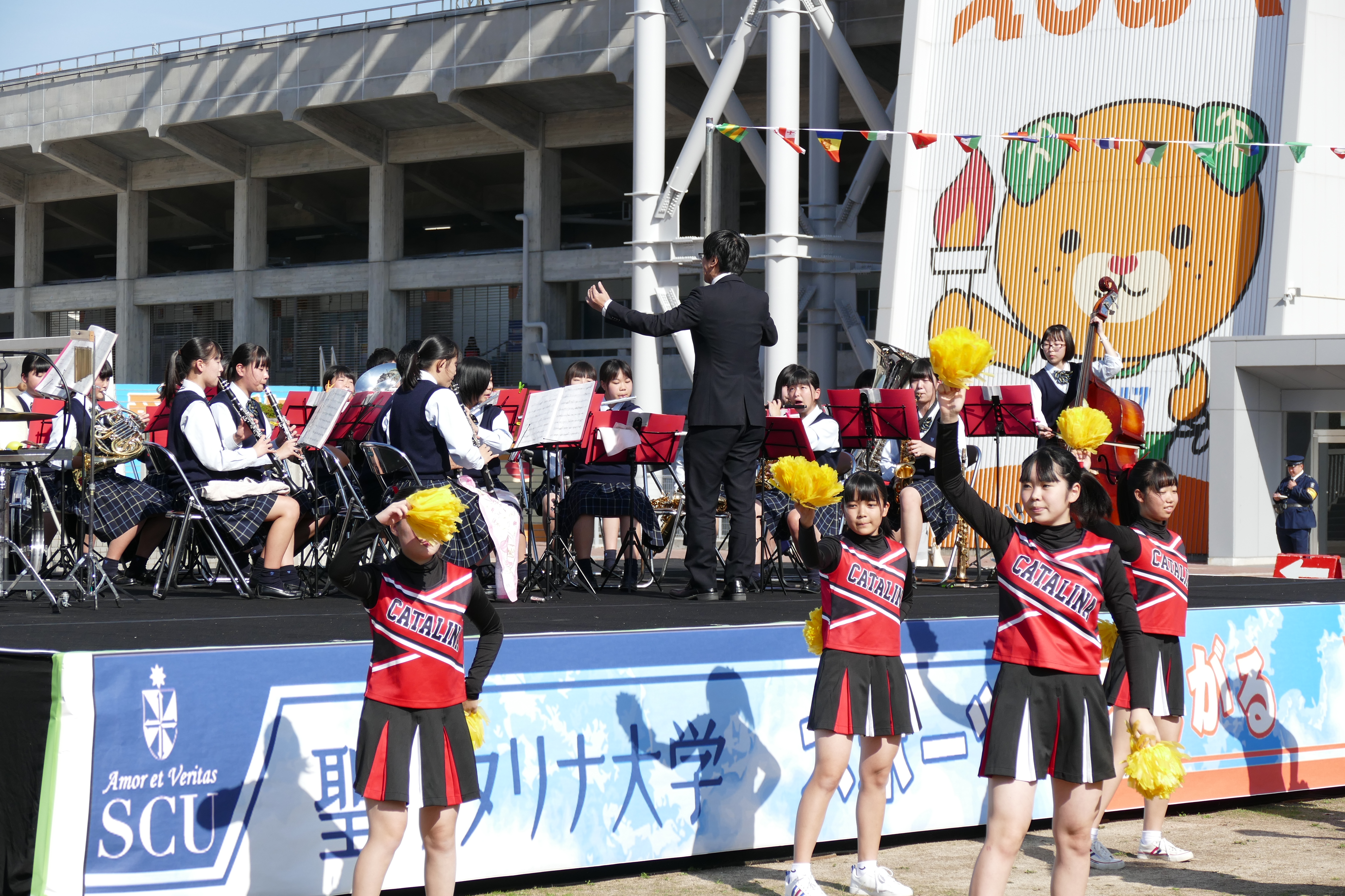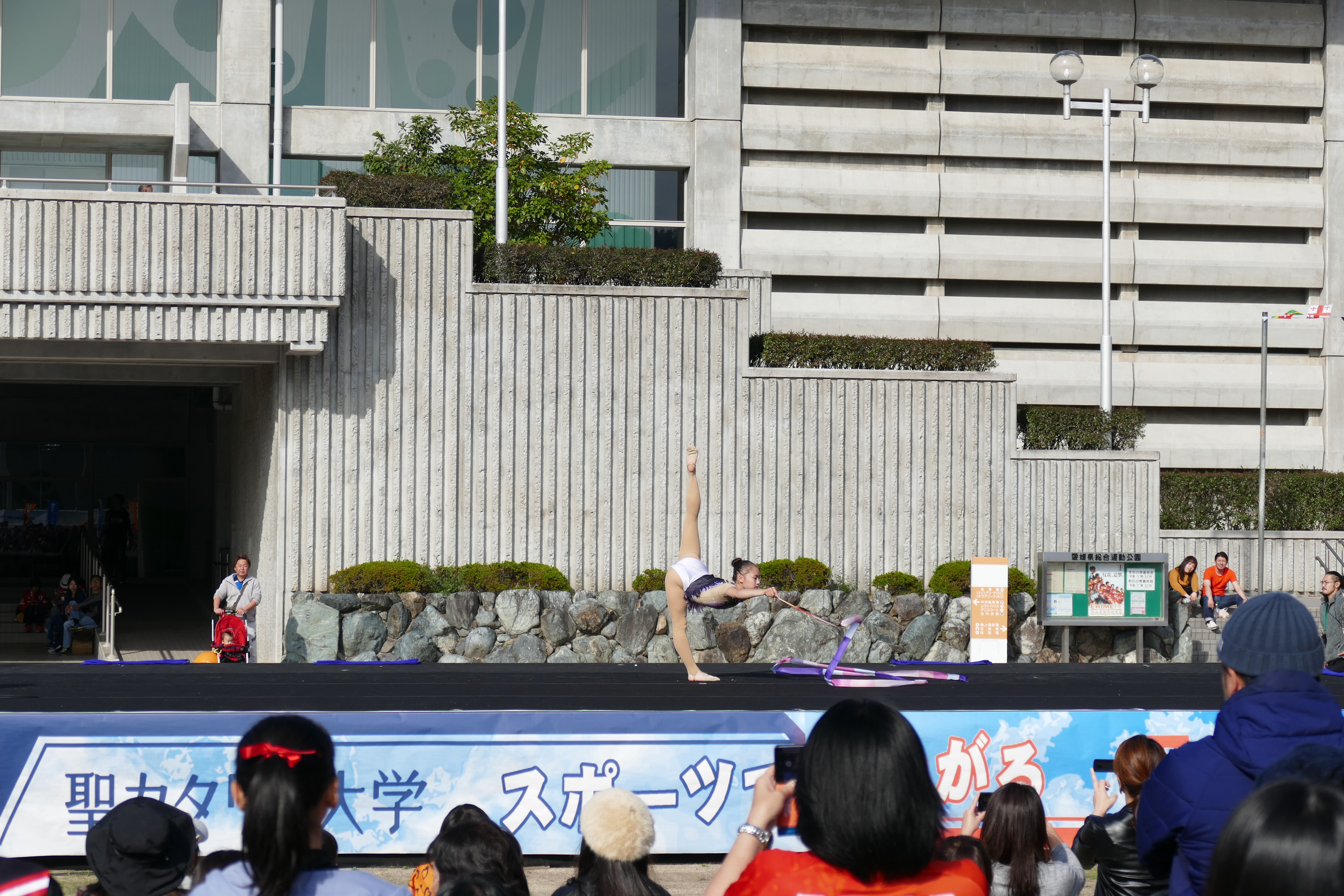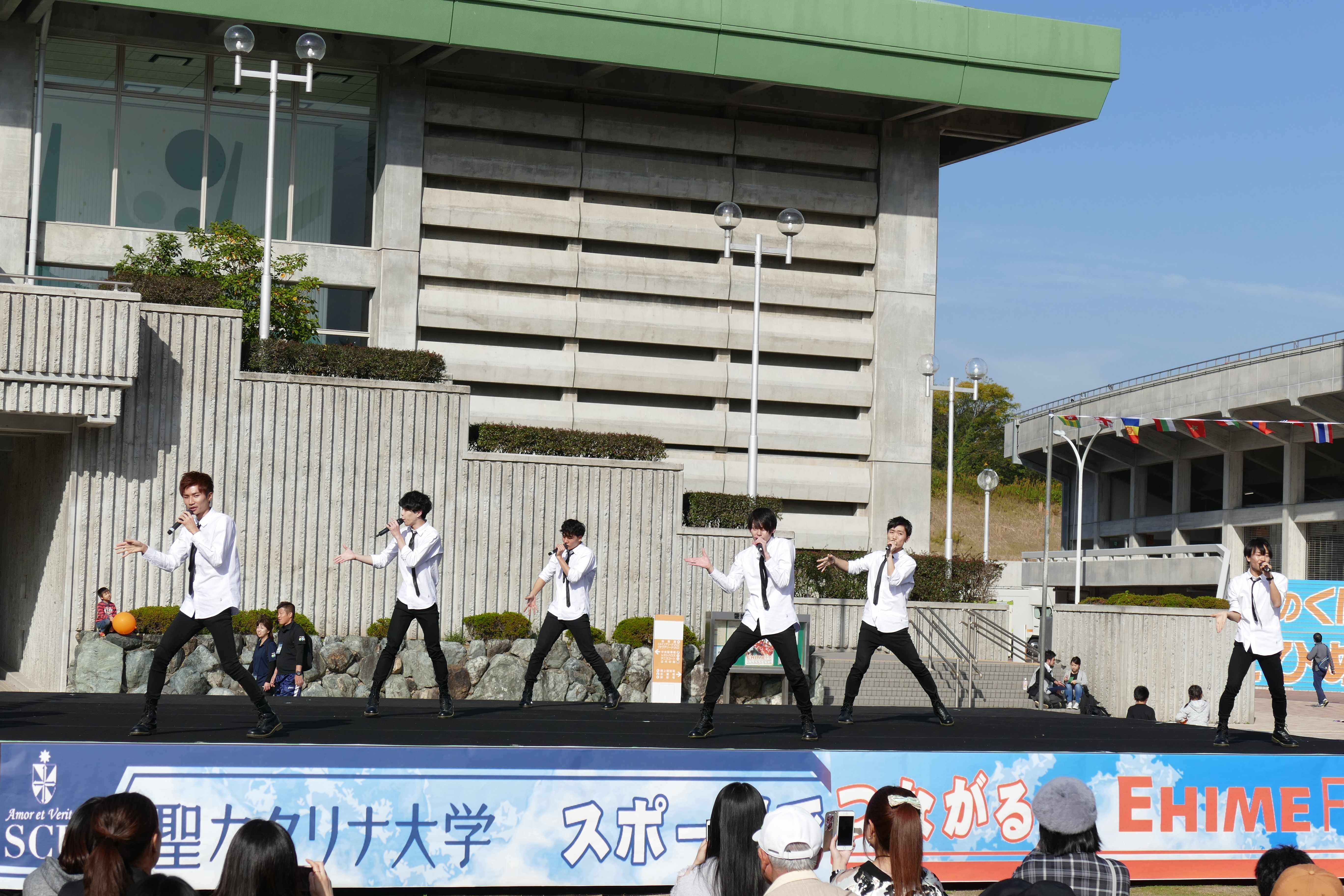 ステージショーでは、聖カタリナ学園高等学校の吹奏楽部、新体操、チアリーディングの発表や、聖カタリナ大学のジャグリング、ダンス部の発表を行いました。最終パフォーマンスでは松山発メンズアイドルグループである「唯我独尊(ゆいがどくそん)」のステージがあり、大いに盛り上がりました。なお、唯我独尊のメンバーには本学学生の西山俊彦君が加入しています。