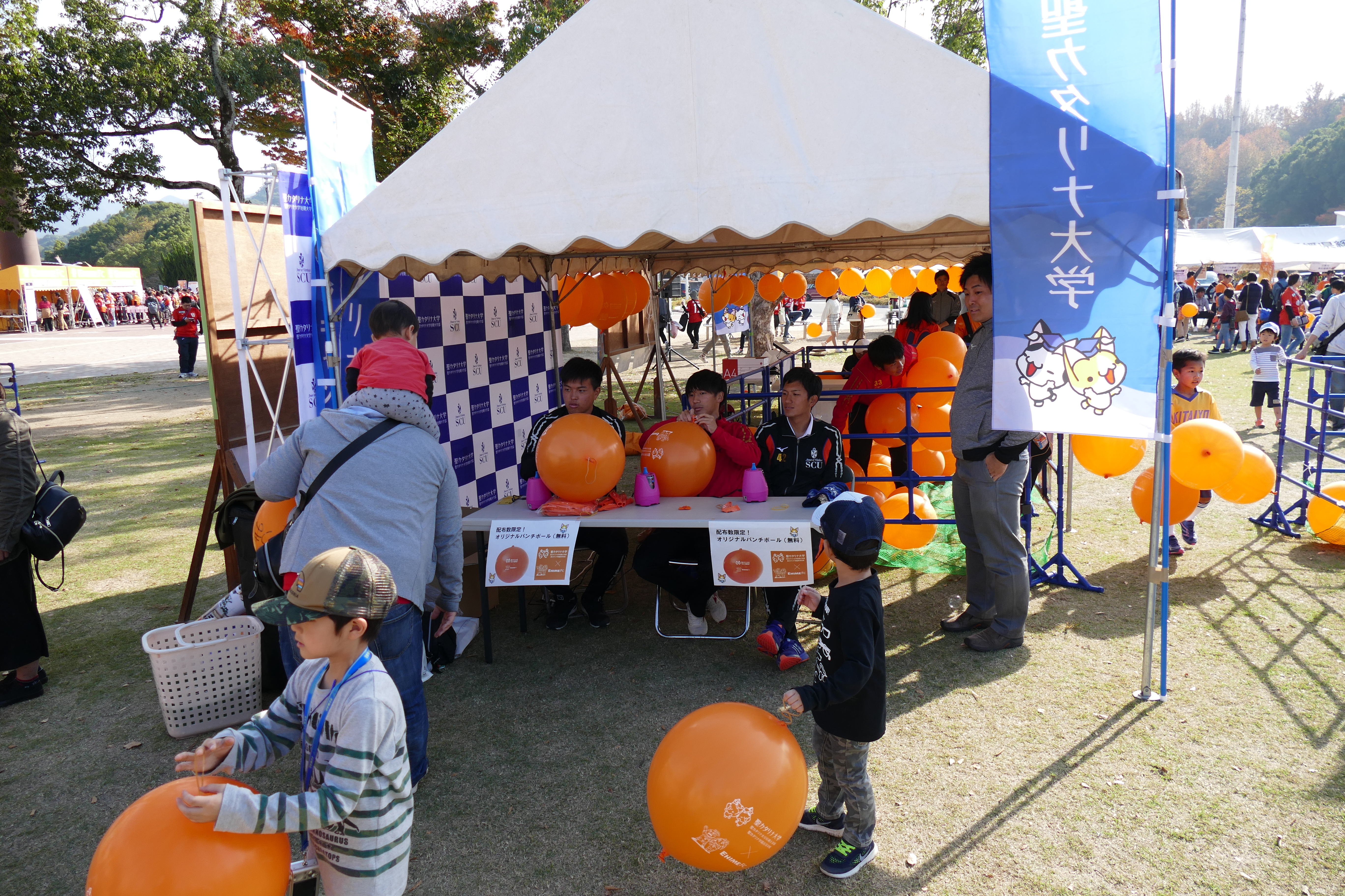イベントブースでは、お子様が楽しめるゲーム(キックターゲット、卓球等)、健康度チェックブース、愛媛FCと本学のオリジナルパンチボールの配布を行いました。