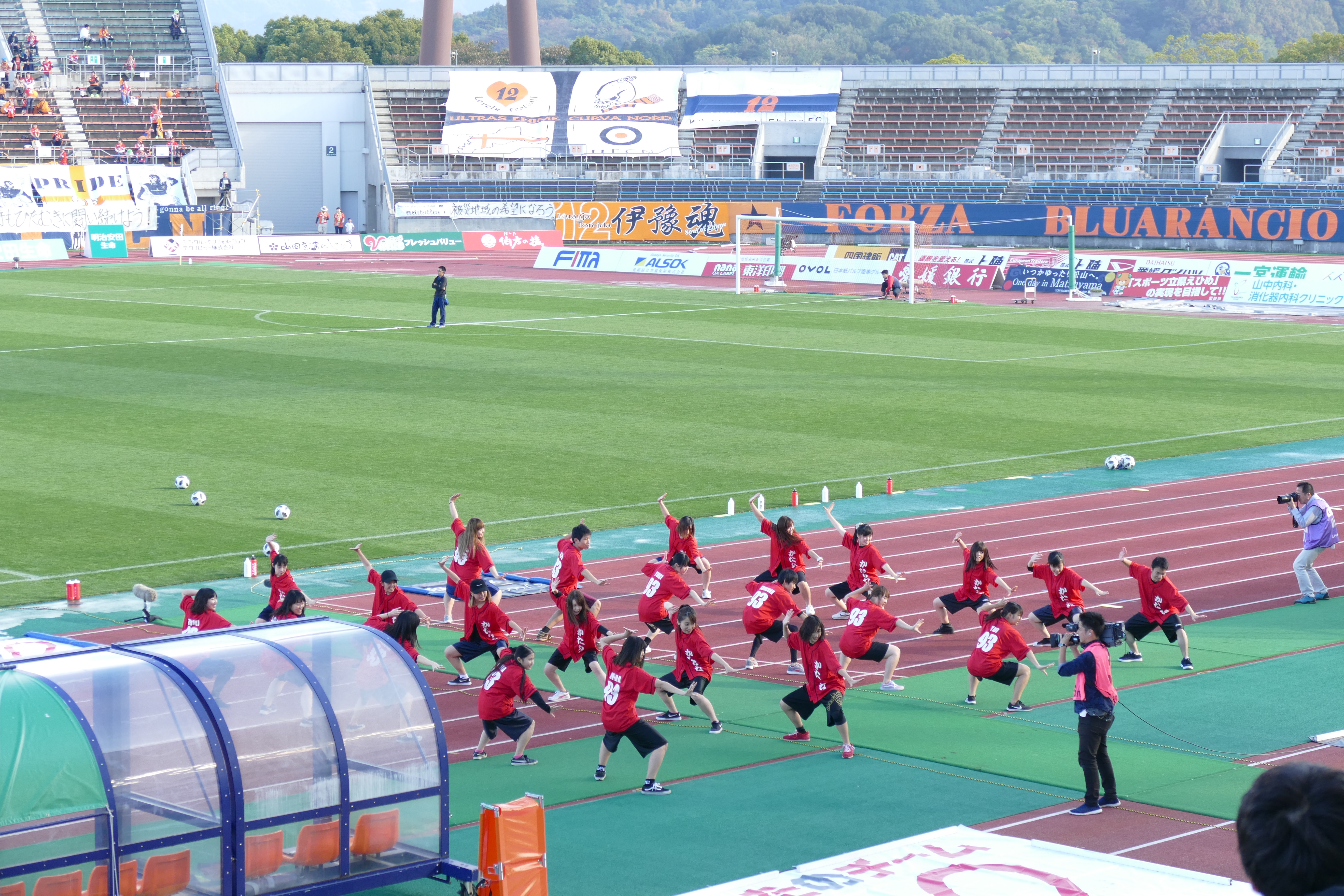 今期ホームでの最終試合でもあり、愛媛県民が一体となり試合を応援する中、試合開始前にはスタジアム内で本学学生が野球拳踊りを披露しました。
