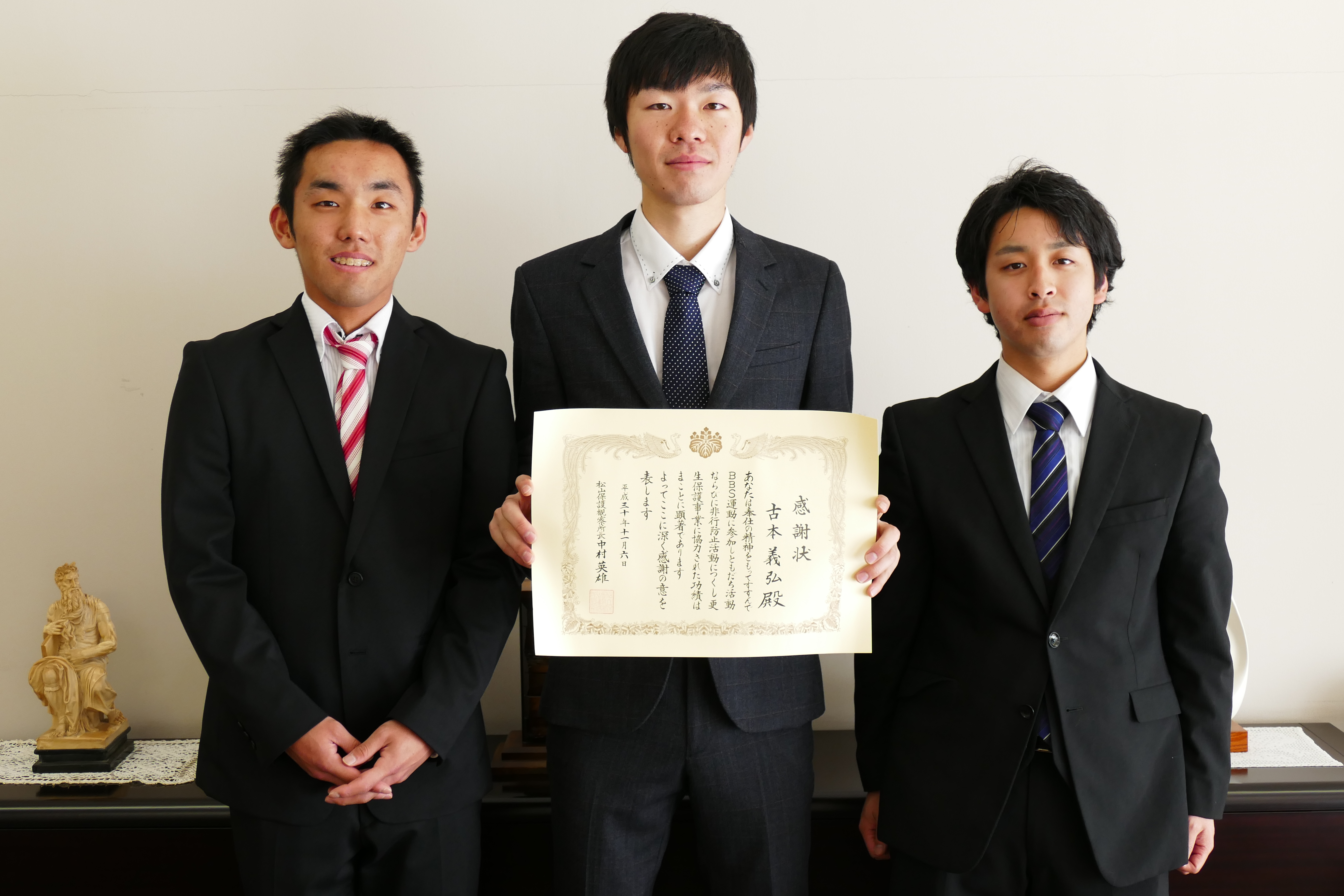 平成30年11月6日、愛媛県生涯学習センターで開催された「平成30年度 愛媛県更生保護事業関係者顕彰式典」にて、本学BBS同好会の社会福祉学科4年 荒木誉史さん、古本義弘さん、松井豊さんが、松山市保護観察所長感謝状をいただきました。