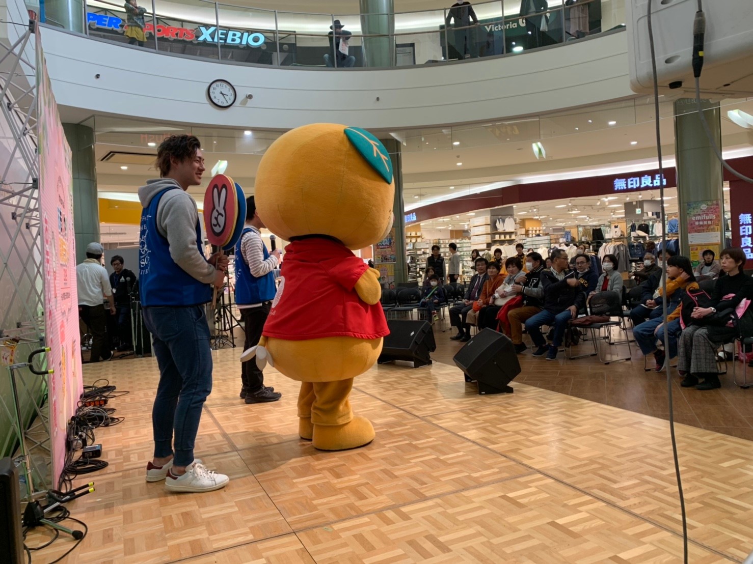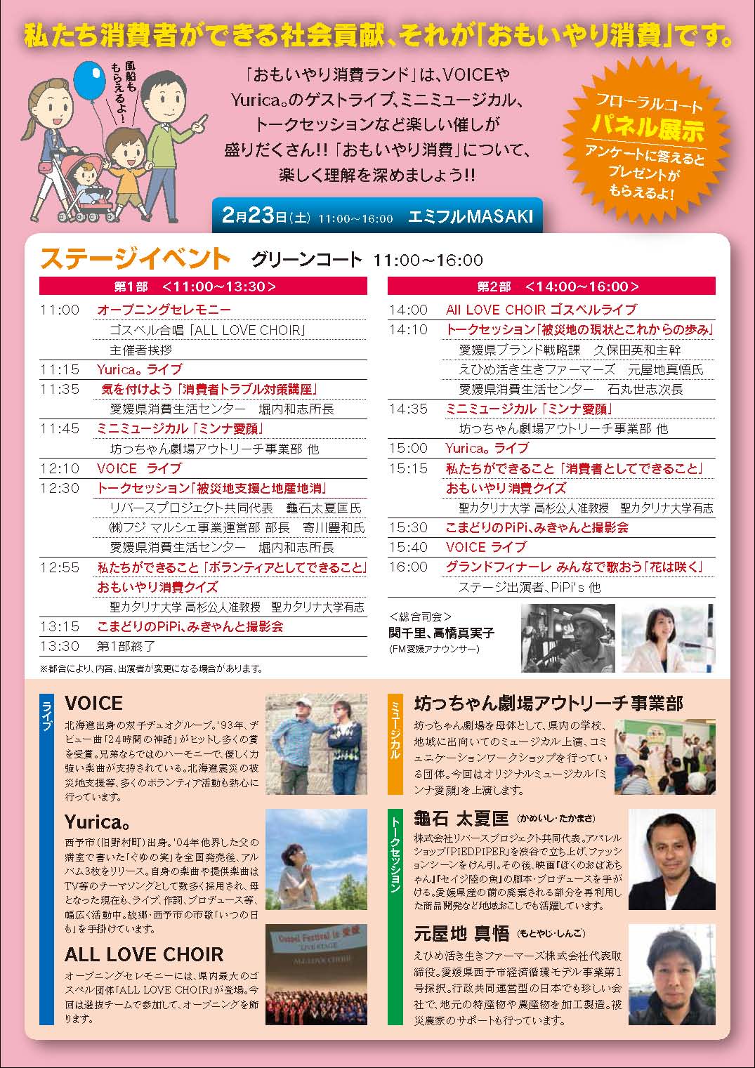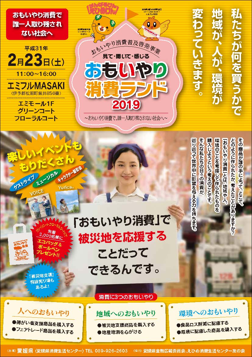 2月23日(土)、愛媛県消費生活センターが主催するイベント「おもいやり消費ランド2019」がエミフルMASAKIグリーンコートで行われ、聖カタリナ大学社会福祉学科の学生5人がイベントを盛り上げました。