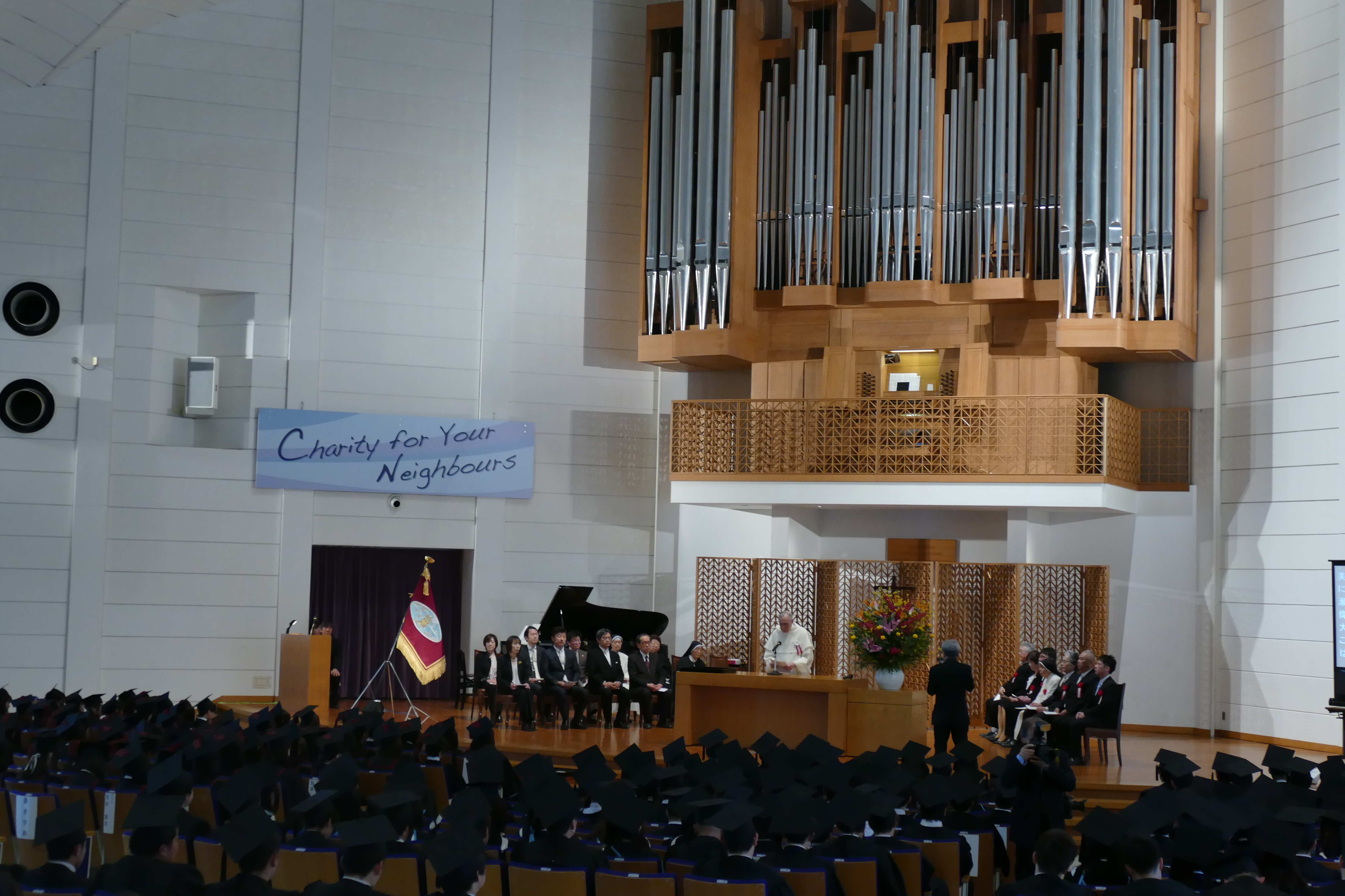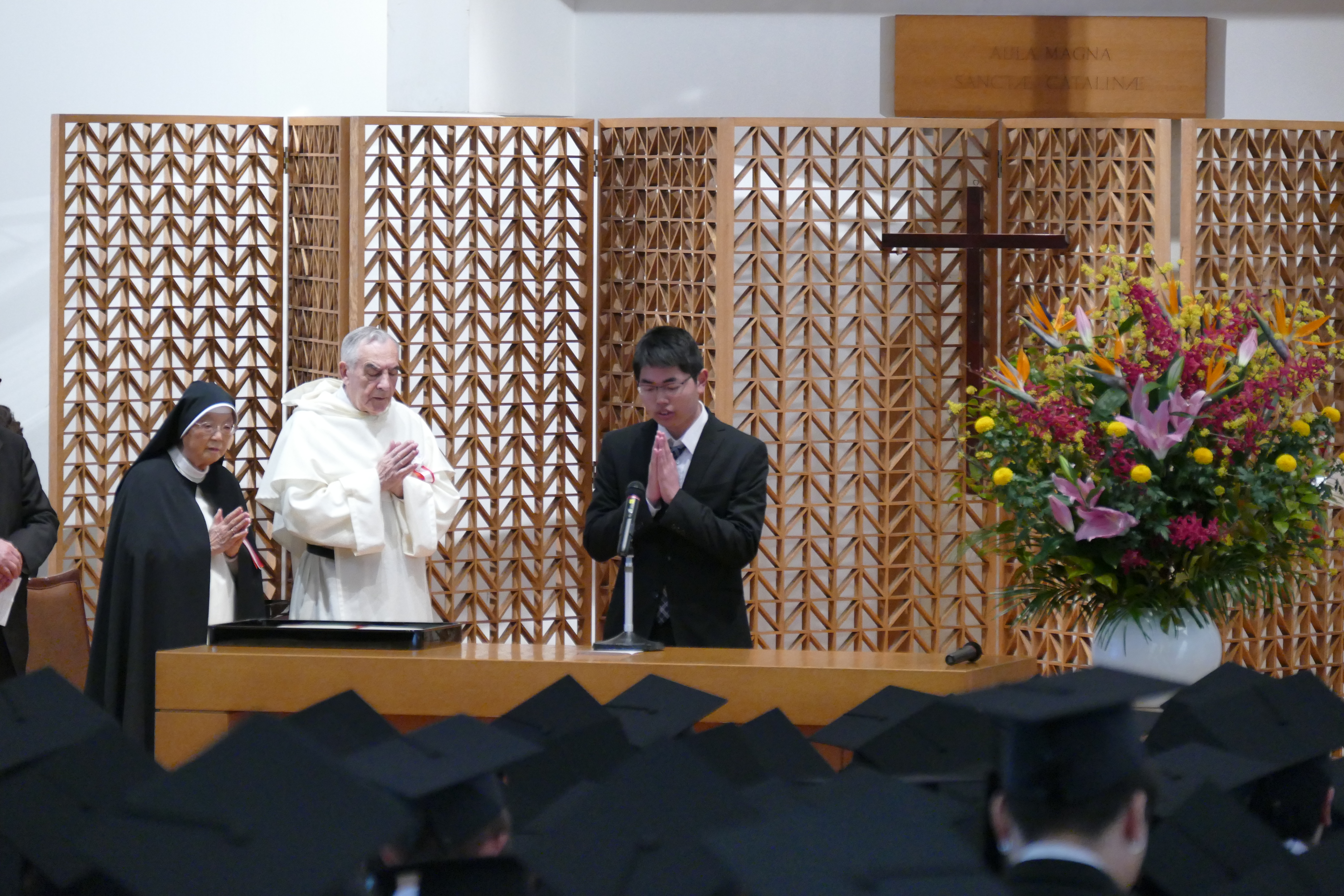 当日は厳かな雰囲気の中、卒業生はガウンと角帽で正装して聖歌斉唱や聖書朗読を行いました。その後、ホビノ・サンミゲル学長から各学科の代表者に卒業証書が授与されました。