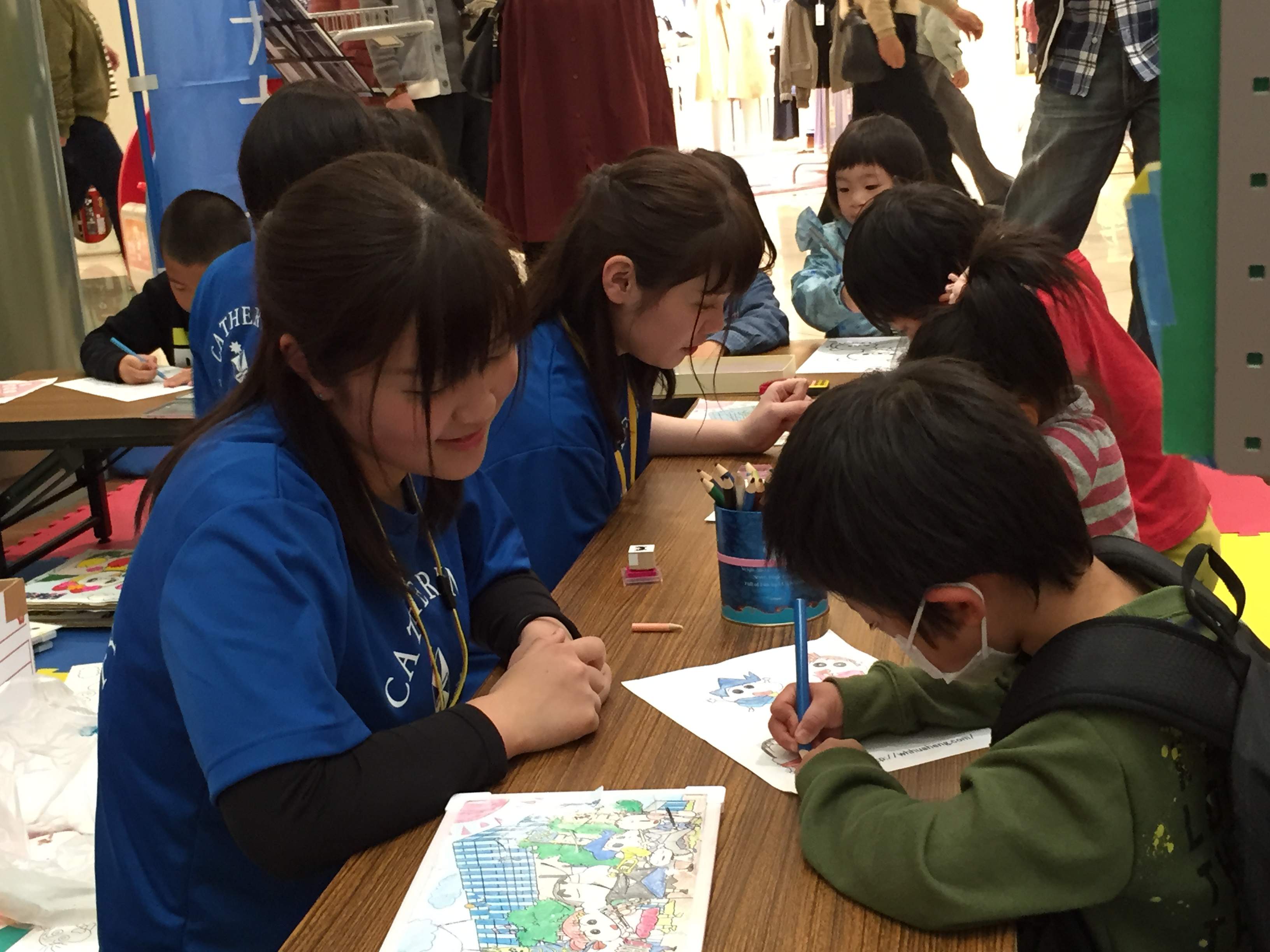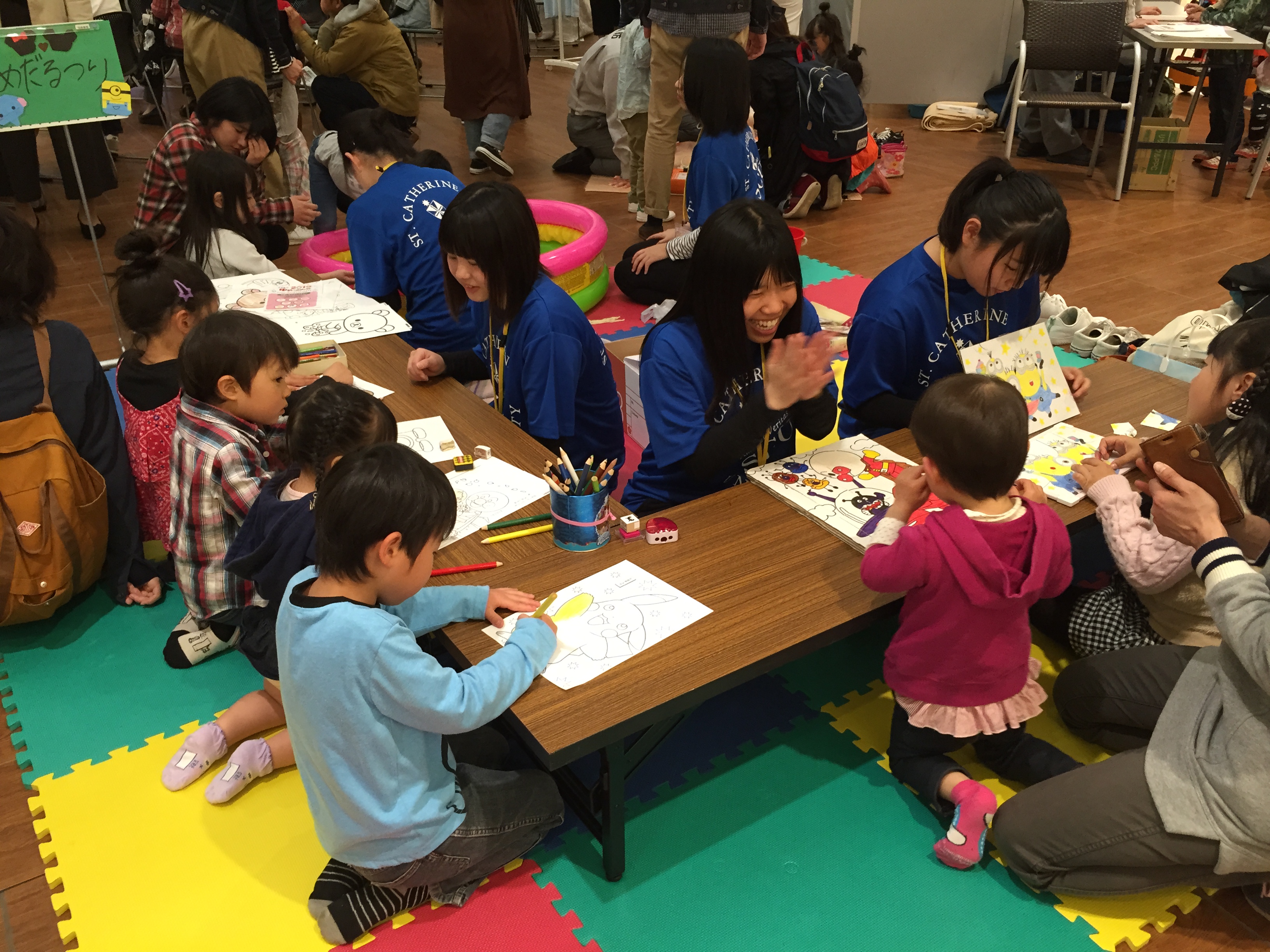 保育学科の学生は、保育士や幼稚園教諭のお仕事として3つの遊びコーナーを準備し、子どもたちに楽しい時間を過ごしてもらえるように参加しました。どのコーナーも人気で、約250組のご家族に楽しんで頂くことができました。
