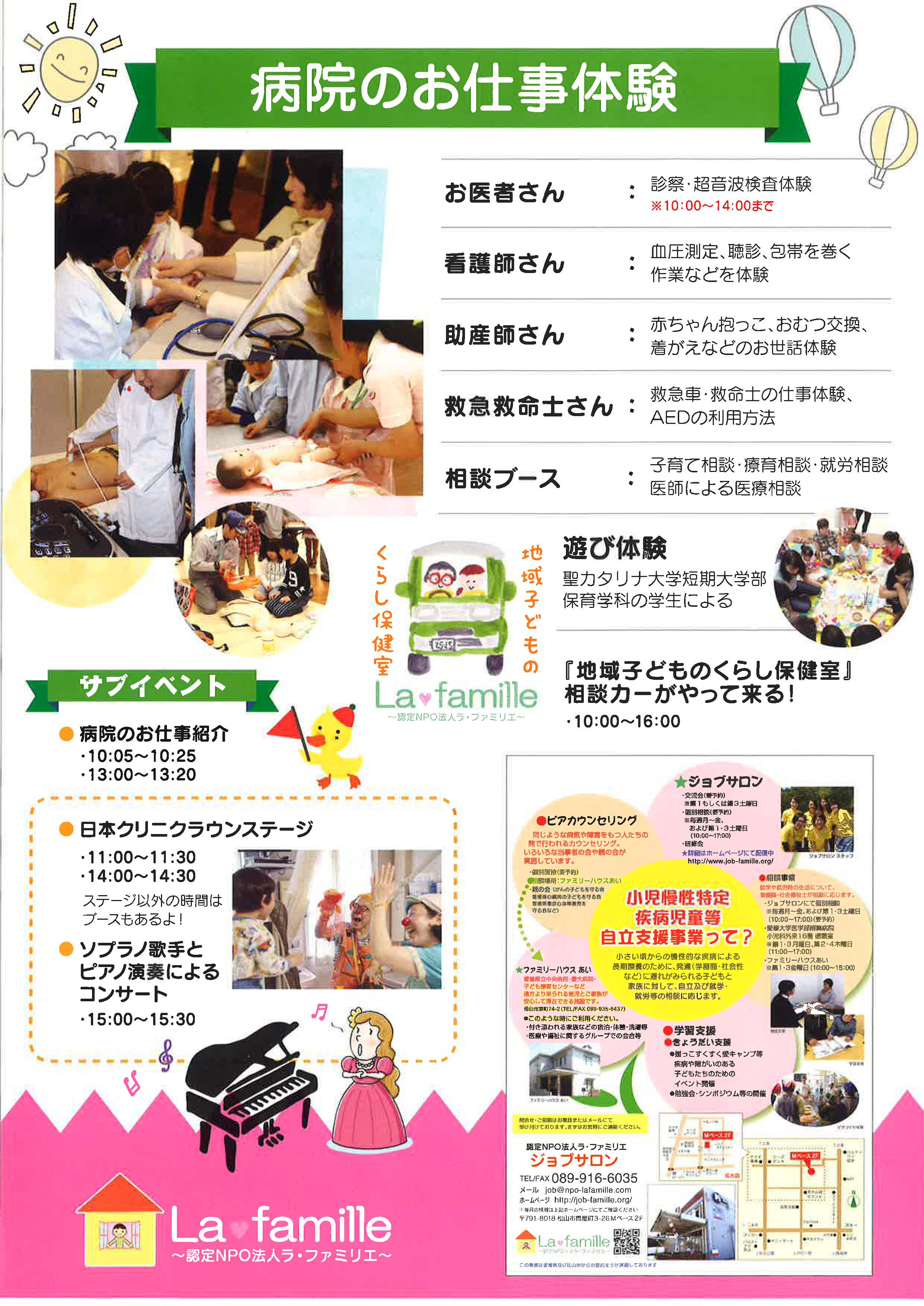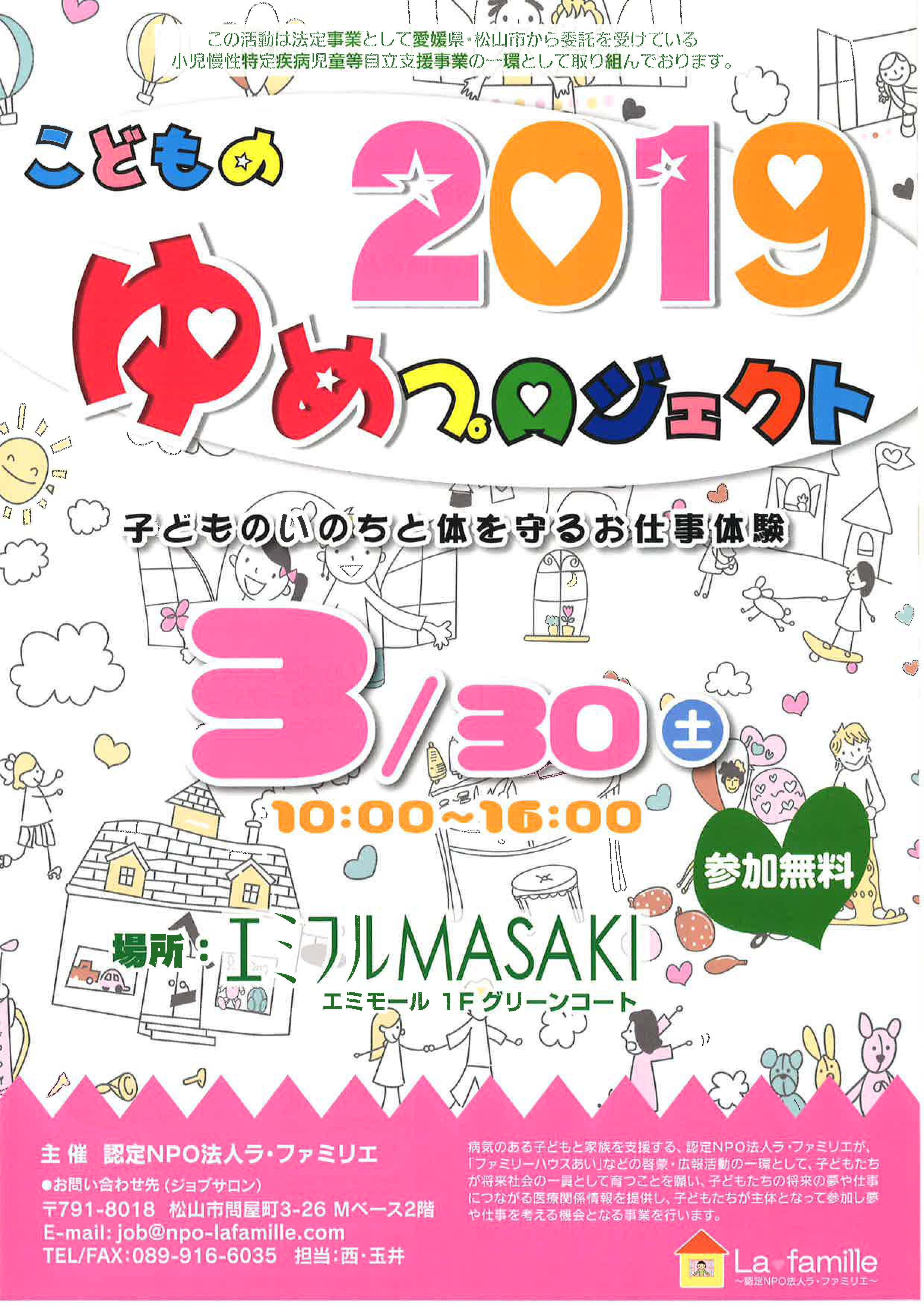 3月30日(土)、エミフルMASAKIにおいて「子どものゆめプロジェクト2019」-子どものいのちと体を守るお仕事体験―のイベントが開催されました。このイベントは、認定NPO法人ラ・ファミリエが小児慢性特定疾病児童等自立支援事業の一環として主催しているものです。
