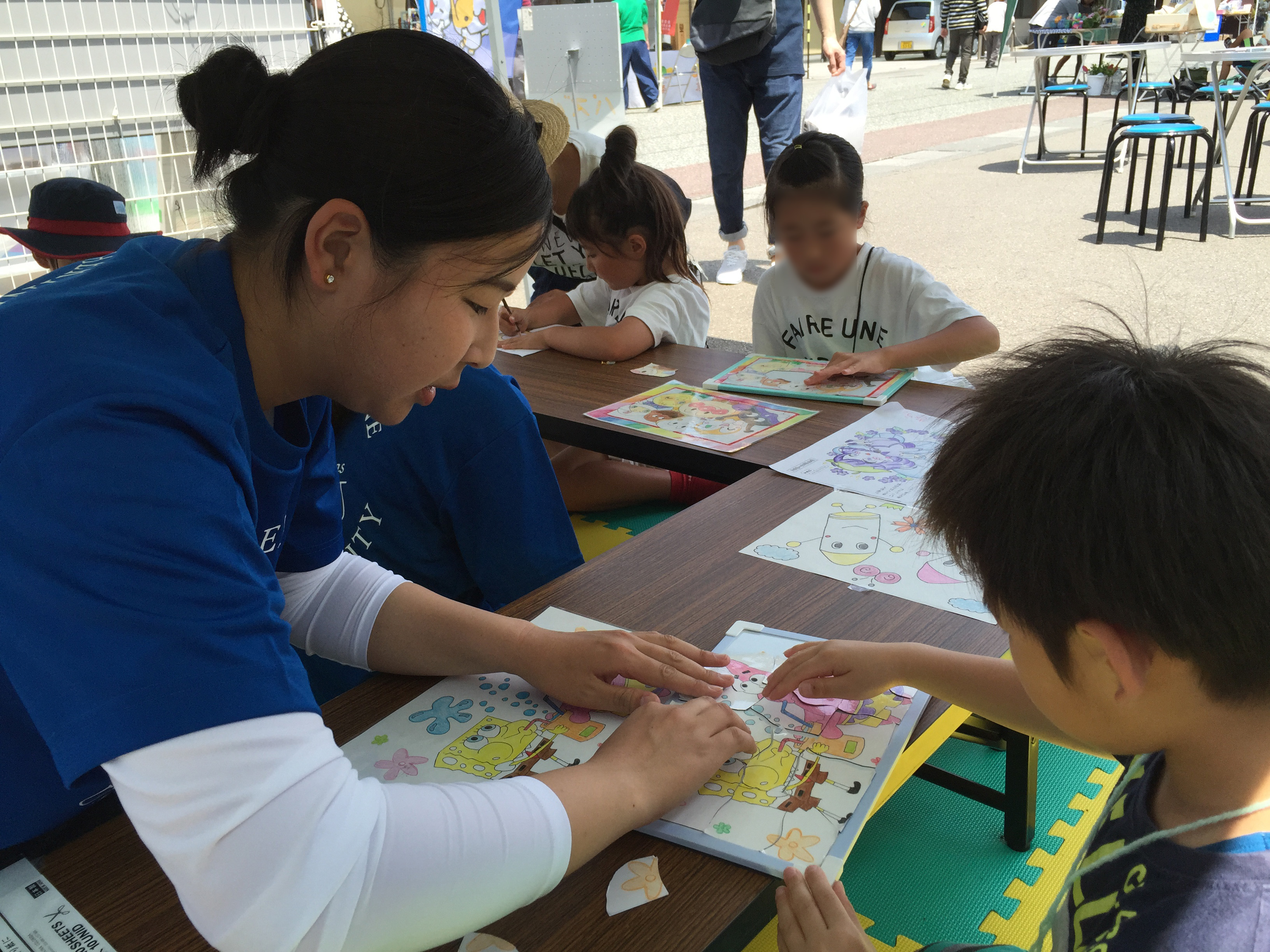 道沿いの飲食関係の店舗からの出展や、手作りアクセサリーやネイルなどの出展もある中、保育学科でレクリエーション・インストラクターの資格取得を目指す2年生が「キャラクターメダル釣り」や「ぬり絵」「パズル」の遊びコーナーを準備しました。