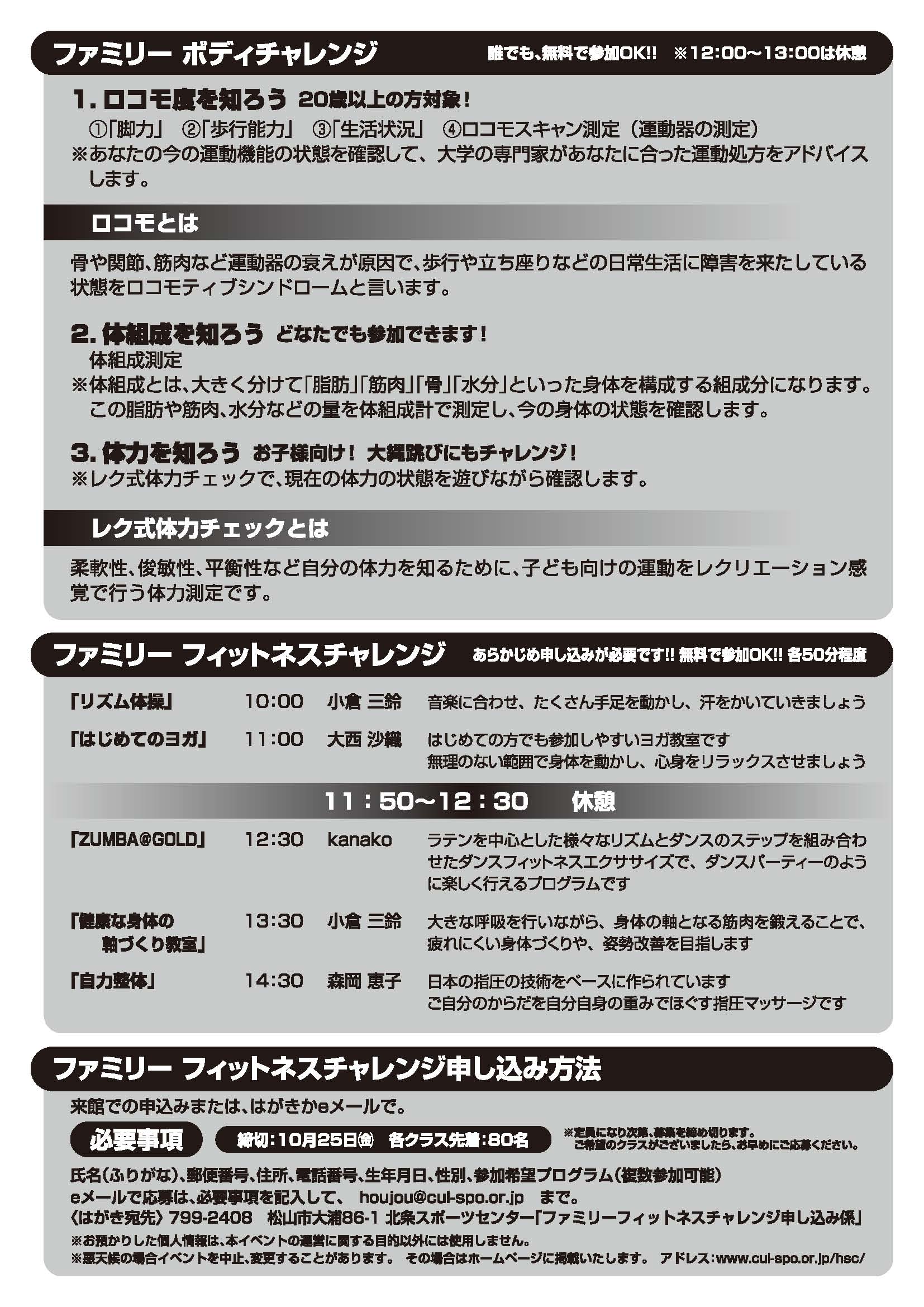 このイベントは松山市文化・スポーツ振興財団と本学が連携協定の一環として開催されるもので、様々なフィットネスを年齢関係なく体験していただける「ファミリーフィットネスチャレンジ」、最新機器ロコモスキャンや体組成計を使った身体測定、遊び感覚で体力を知ることができるレク式体力チェックを行う「ファミリーボディチャレンジ」の他、グラウンドゴルフ大会など、無料で参加できます。(※フィットネス体験は事前申し込みが必要です)