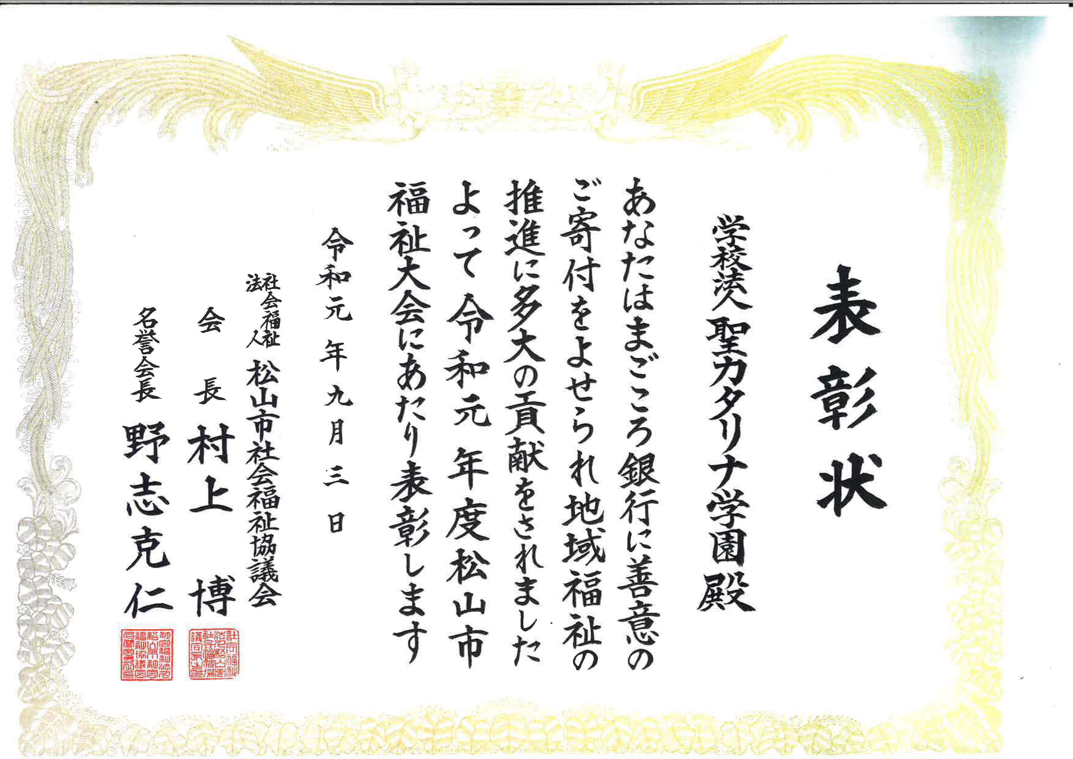 9月3日(火)、令和元年松山市福祉大会にあたり学校法人聖カタリナ学園(聖カタリナ大学・聖カタリナ大学短期大学部・聖カタリナ学園高等学校)が社会福祉法人 松山市社会福祉協議会より表彰されました。 学校法人聖カタリナ学園では、えひめ・松山産業まつり(すごいもの博)、松山まつり等の学外イベントでチャリティゲームを毎年開催し、そのイベントでの収益金をまごころ銀行へ全額寄付しており、その取り組みが地域福祉の推進に多大な貢献をしていると評価されての受賞となりました。