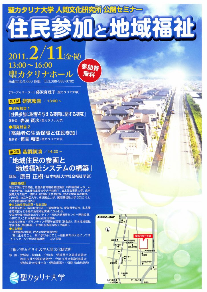 聖カタリナ大学人間文化研究所では、本年度の研究テーマ 「住民参加と地域福祉」の下、 日本福祉大学講師 原田 正樹 先生をお招きして、「地域住民の参画と地域福祉システムの構築」をテーマとした公開セミナーを開催いたします。住民参加と地域福祉に関心をもっておられる方々は勿論、広く多くの市民の皆様のご参加をお待ち申し上げます。参加費無料。駐車場有り。