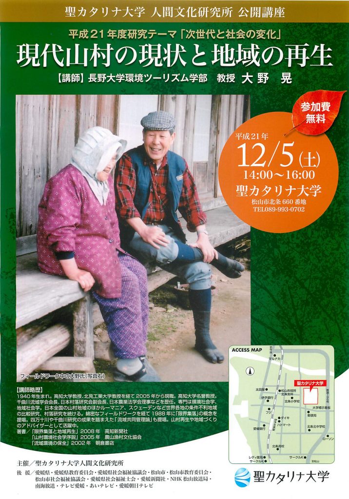 聖カタリナ大学人間文化研究所では、今年度研究テーマ 「次世代と社会の変化」の下、 「現代山村の現状と地域の再生」をテーマに長野大学教授 大野 晃 先生をお招きして、公開講演会を開催することにいたしました。山村再生や地域づくりに関心をもっておられる方々は勿論、広く多くの市民の皆様のご参加をお待ち申し上げます。