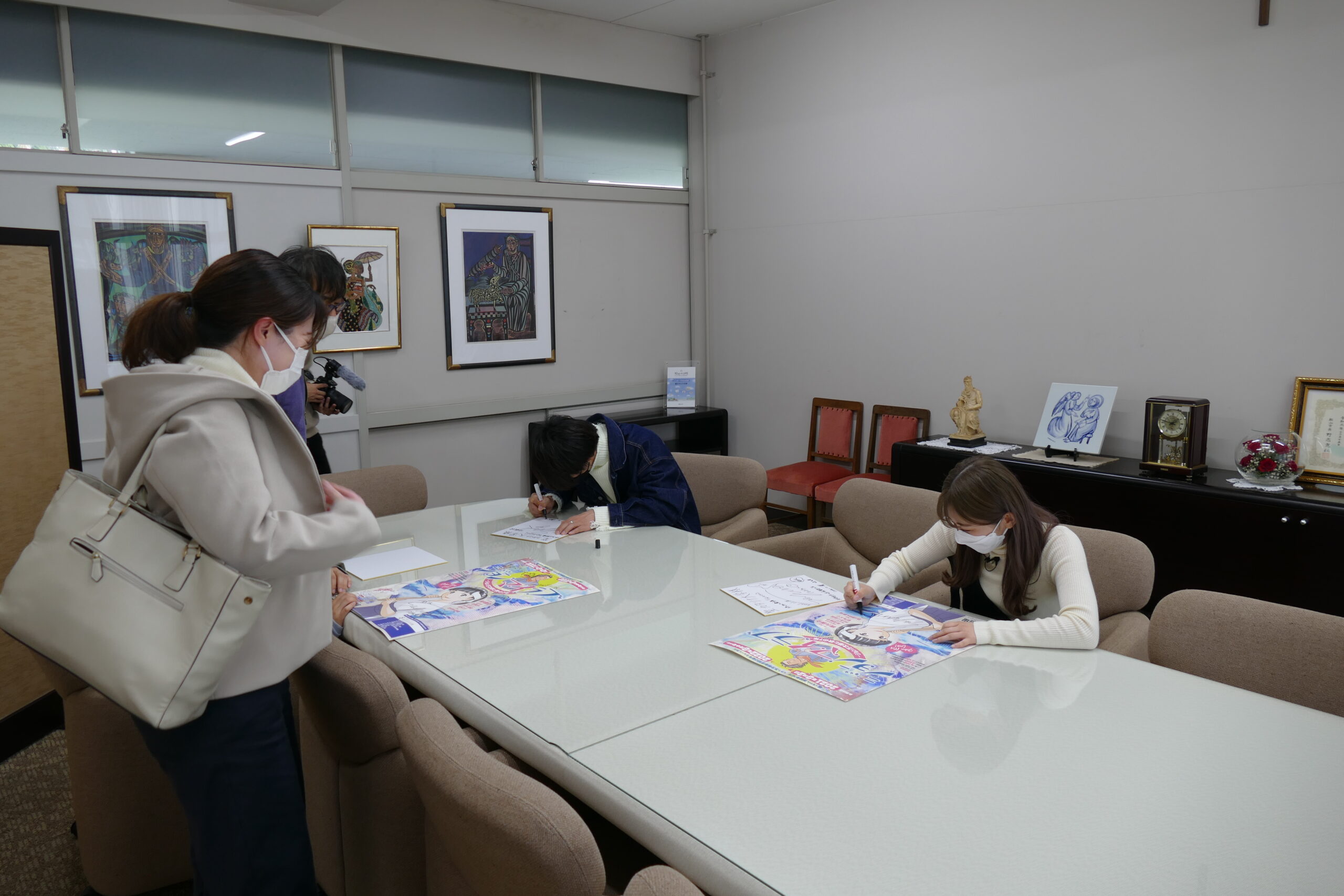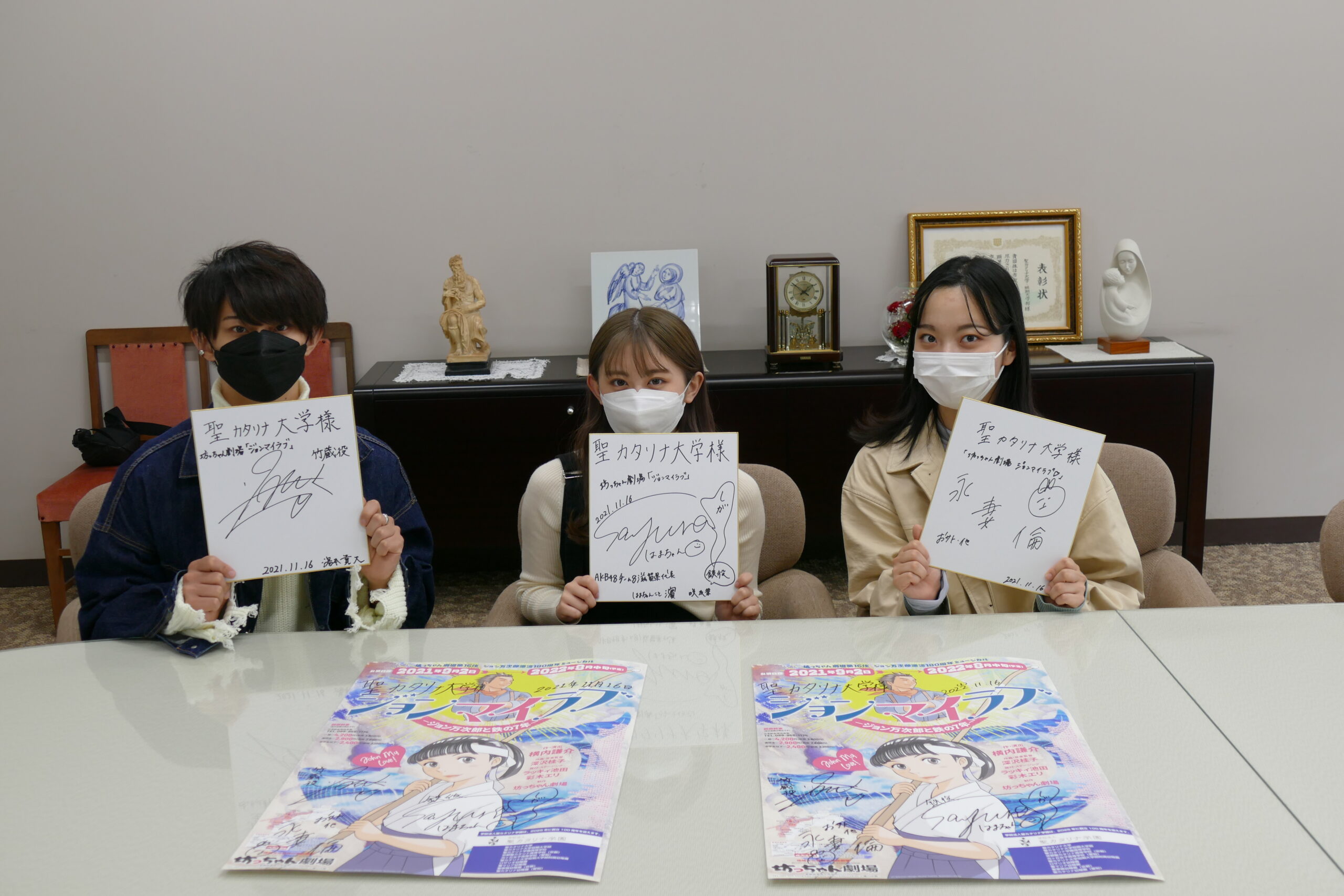 動画では、坊っちゃん劇場のミュージカル「ジョンマイラブ」にヒロイン「鉄」役で出演していたAKB48チーム8の濵 咲友菜さんと竹蔵役の湯本貴大さんと女中役の永妻倫さんが来学し、アルベルト・カルペンティール宗教画ギャラリーで撮影を行いました。